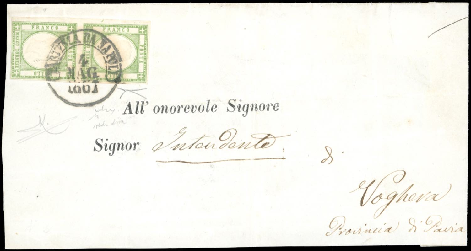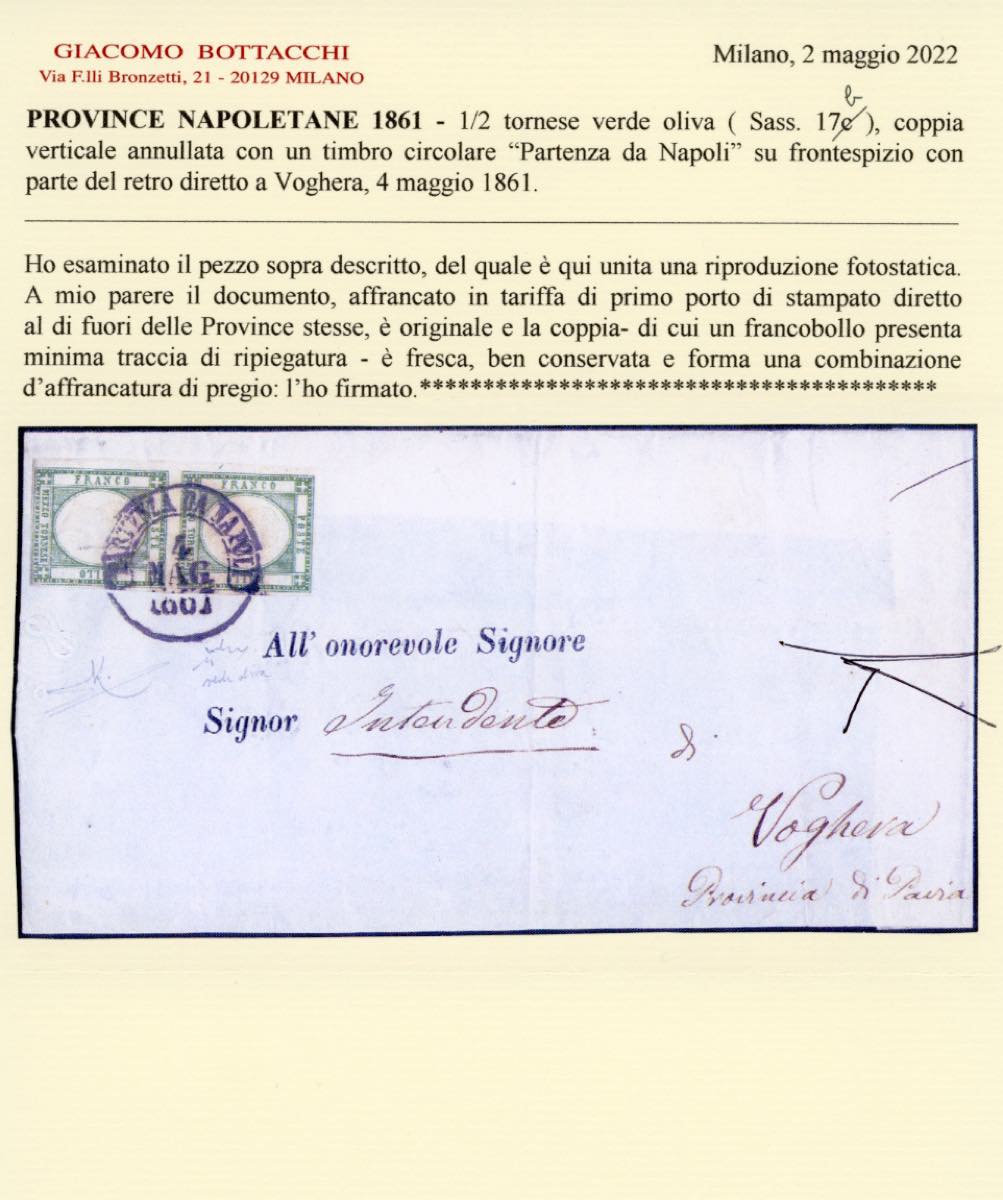 1861 - 1/2 tornese verde oliva (17b), coppia verticale, il primo esemplare con lieve piega, su frontespizio di circolare da Napoli 4/5/1861 a Voghera. Molto fresca, ottimo aspetto. Chiavarello. Raybaudi, cert. Bottacchi. Ex coll. Imperato.