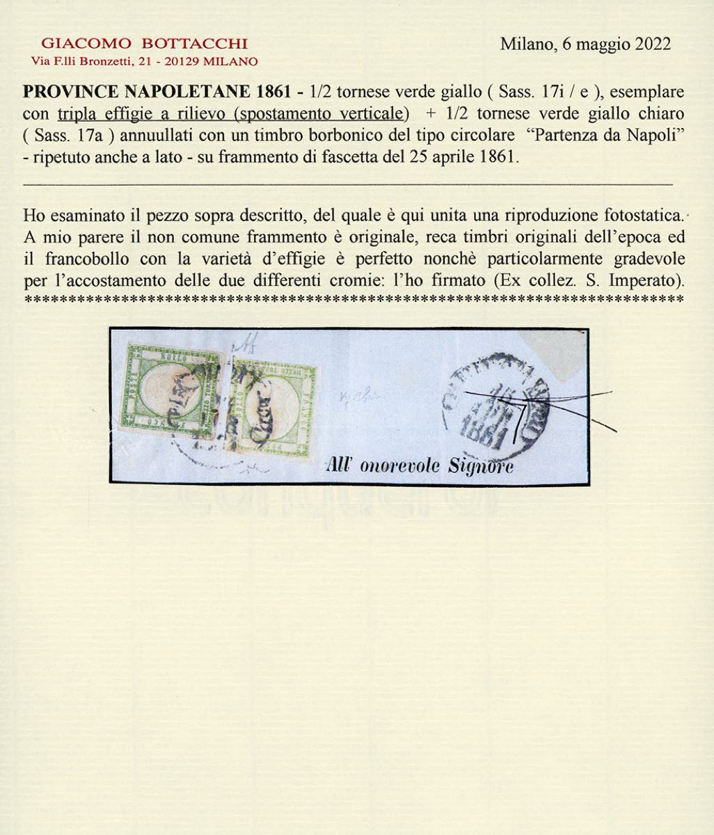 1861 - 1/2 tornese verde giallo, TRIPLA EFFIGIE, perfetto, 1/2 tornese verde giallo chiaro, sfiorato in basso (17i/e,17a), su frammento di fascetta da Napoli 15/4/1861. Rara varietà, impreziosita dalla presenza del gemello di colore diverso. Si tratta dell'UNICO ESEMPLARE DEL 1/2 TORNESE CON TRIPLA EFFIGIE USATO. Grande rarità delle Province Napoletane. A.Diena, Chiavarello, cert. Bottacchi. Ex coll. Imperato.