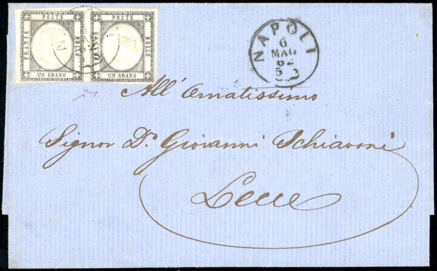 1862 - 1 grano grigio scuro (19a), coppia orizzontale, entrambi gli esemplari con doppia effigie, ottimo stato, su sovracoperta di lettera da Napoli 6/5/1862 a Lecce. Chiavarello. Ex coll. Imperato.