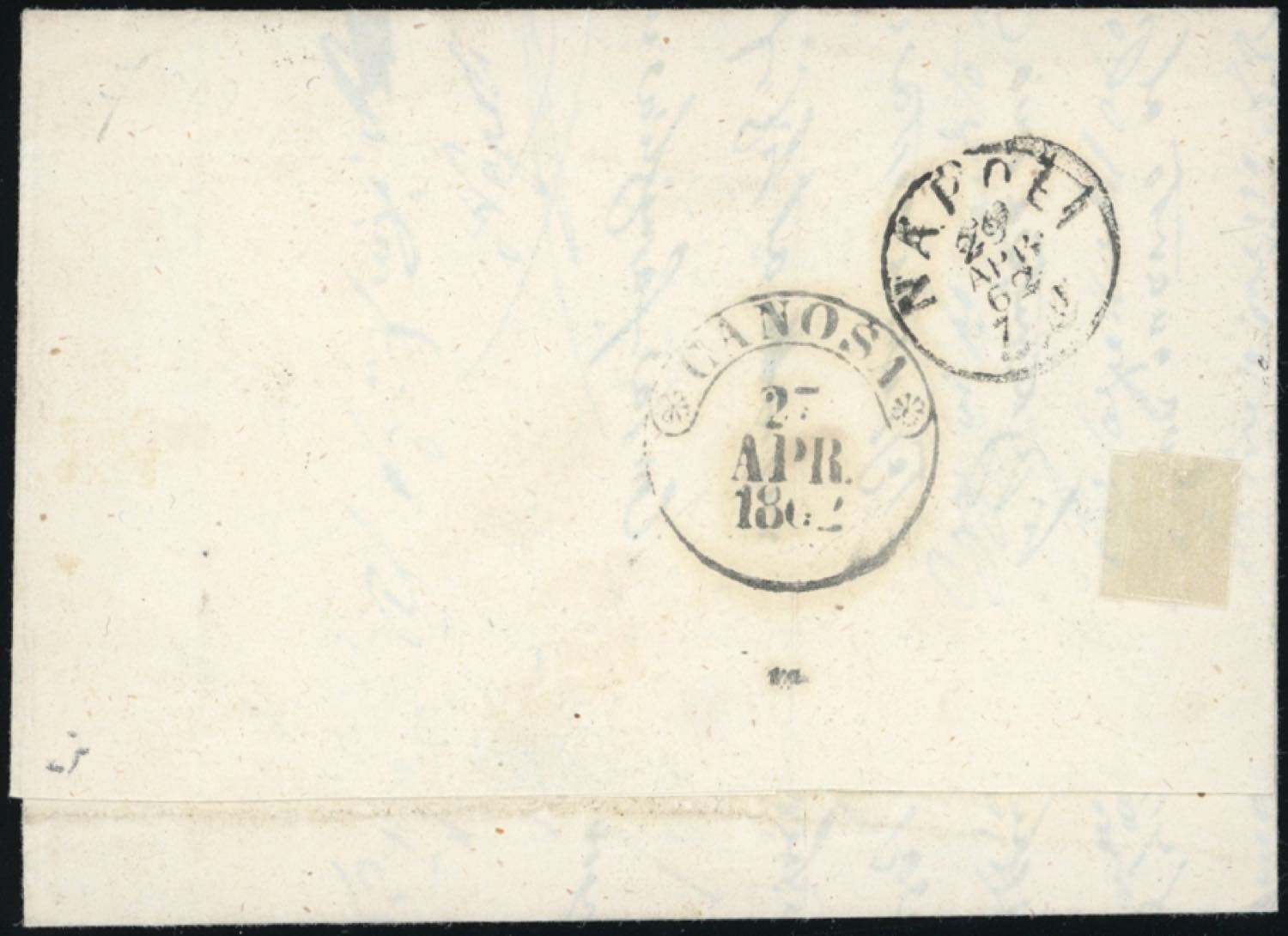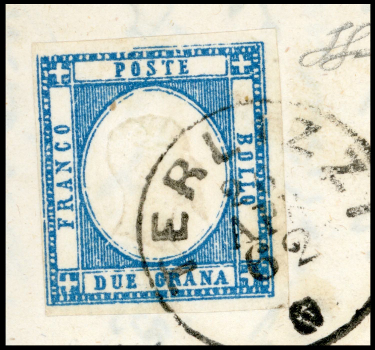 1862 - 2 grana (20), perfetto, STAMPA PARZIALMENTE MANCANTE DELLA CORNICE SUPERIORE, su fresca lettera da Terlizzi 26/4/1861 a Napoli. Bella e rara varietà non catalogata. Chiavarello, cert. Ferrario. Ex coll. Imperato.