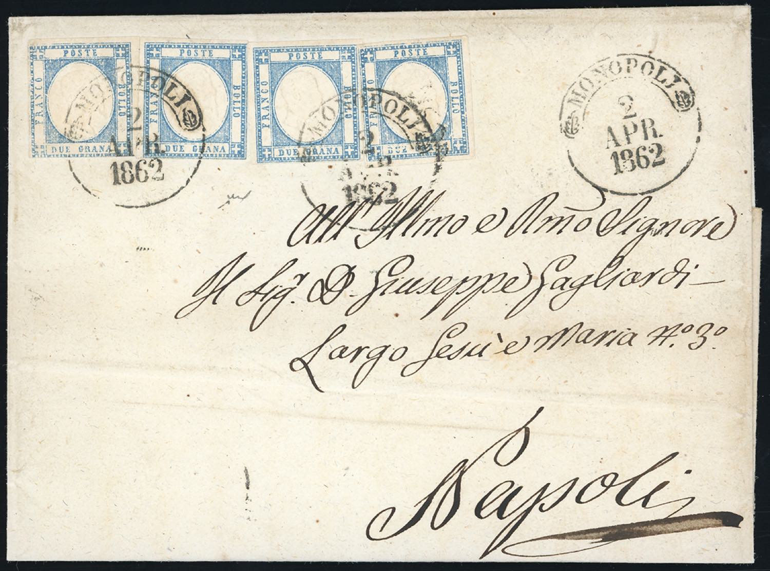 1862 - 2 grana azzurro chiaro (20), quattro esemplari, il primo corto, gli altri in ottimo stato/perfetti, su sovracoperta di lettera di quattro porti da Monopoli 2/4/1862 a Napoli. Non come affrancatura multipla, di ottimo aspetto! Chiavarello. Ex coll. Imperato.