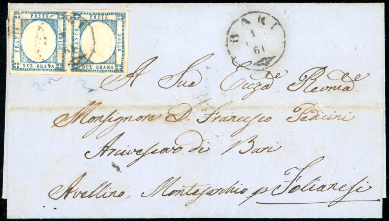 1861 - 2 grana azzurro (20b), coppia orizzontale, perfetta, entrambi gli esemplari con doppia effigie, uno con spostamento verticale, l'altro orizzontale, su sovracoperta di lettera da Bari 1/10/1861 a Montesarchio. Molto interessante. Chiavarello. Ex coll. Imperato.