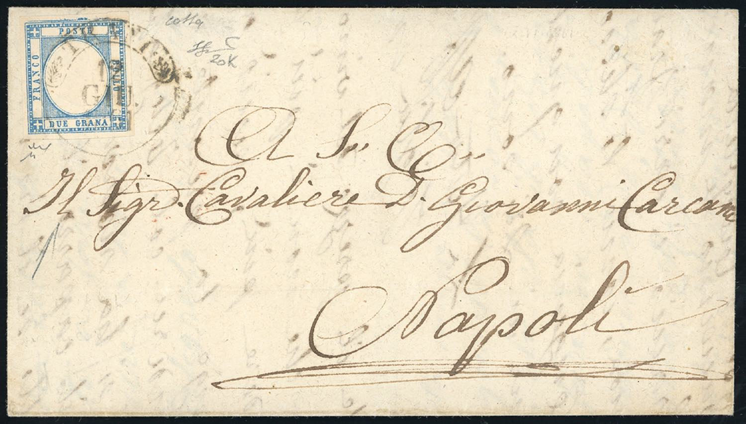 1861 - 2 grana azzurro chiaro, filetto di inquadratura in alto (20k), perfetto, su lettera da Trani 12/6/1861 a Napoli. Bella. Colla, ... Read more