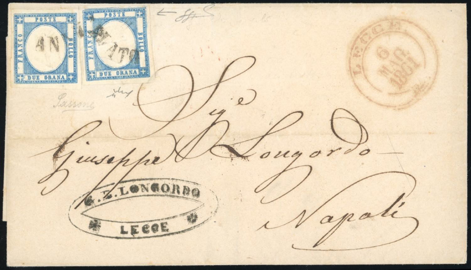 1861 - 2 soldi azzurro chiaro, due esemplari, uno con filetto di inquadratura in alto (20,20k), perfetti, su sovracoperta di lettera da Lecce 6/3/1861, annullo a svolazzo (punti 9), a Napoli. Bella. Chiavarello, Sassone, Ferrario. Ex coll. Imperato.