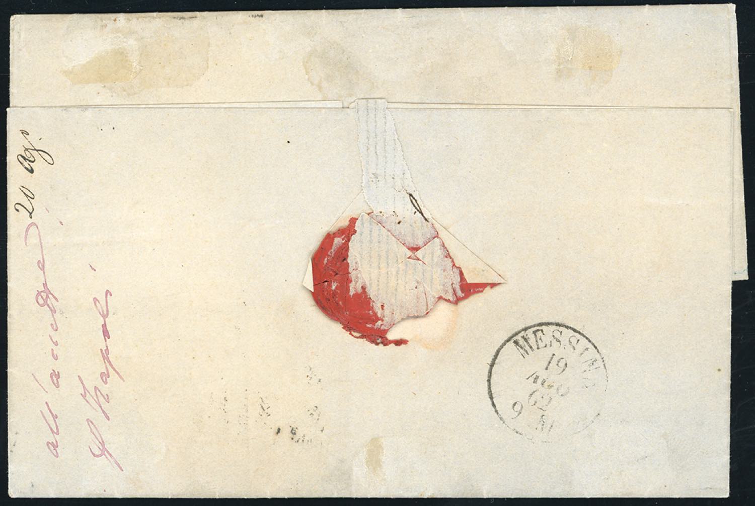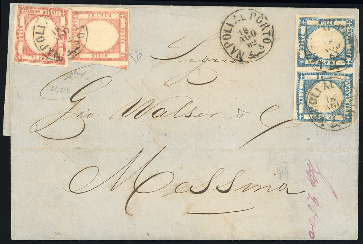 1862 - 5 grana rosso carminio, 5 grana rosa, entrambi con margini completi, 2 grana azzurro, coppia perfetta, (21,21e,20b), su lettera da Napoli 18/8/1862 a Messina. Rara affrancatura di valori gemelli! E.Diena, Chiavarello. Ex coll. Imperato.