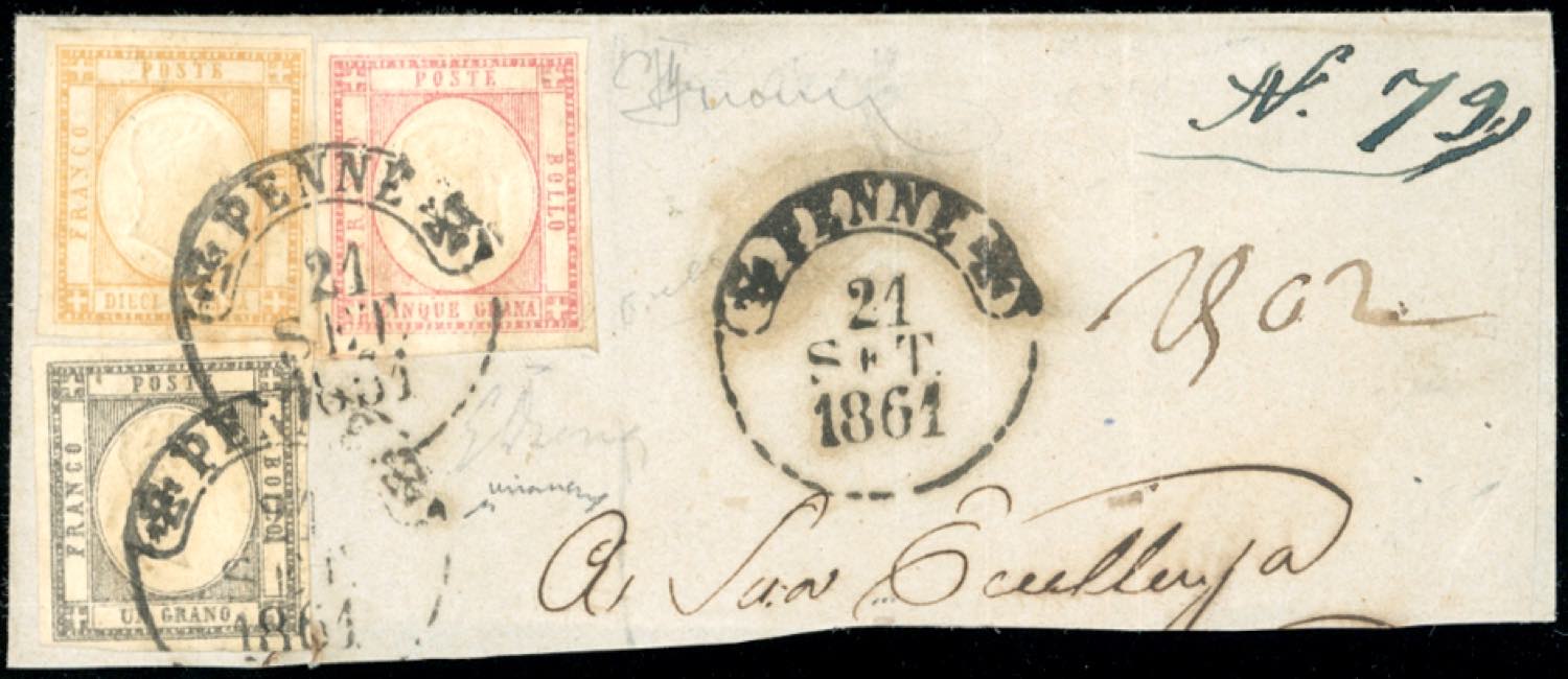1861 - 1 grano grigio scuro, 5 grana rosa, 10 grana bistro (19a,21e,22c), perfetto, su ampio frammento di lettera da Penne 21/9/1861 a ... Read more