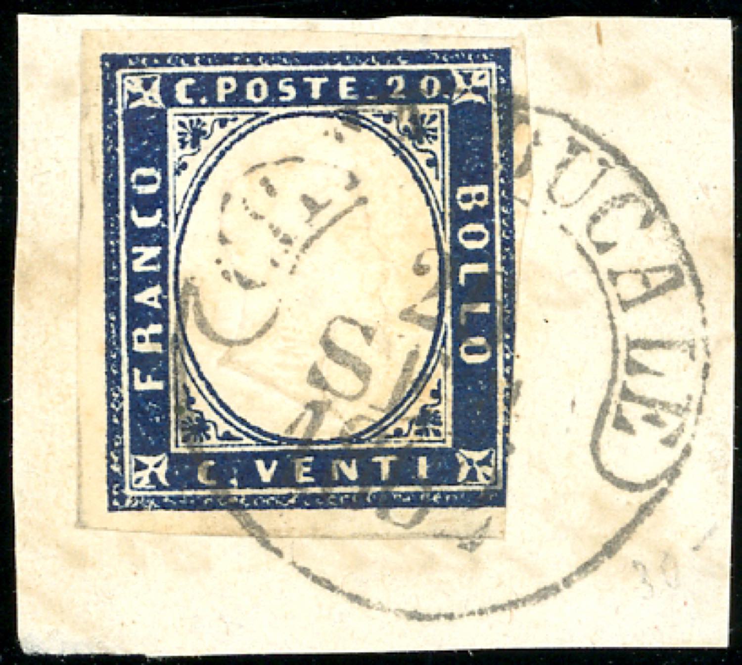 1862 - 20 cent. indaco IV emissione di Sardegna (15E), leggermente intaccato in un punto, usato su frammento a Cittàducale 26/9/1862. Interessante e non comune uso precedente alla data di introduzione ufficiale. Ex coll. Imperato.