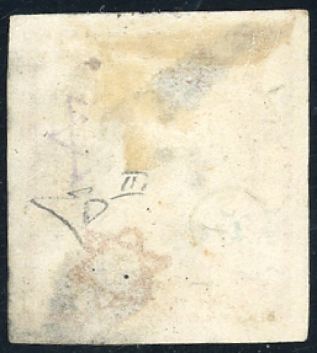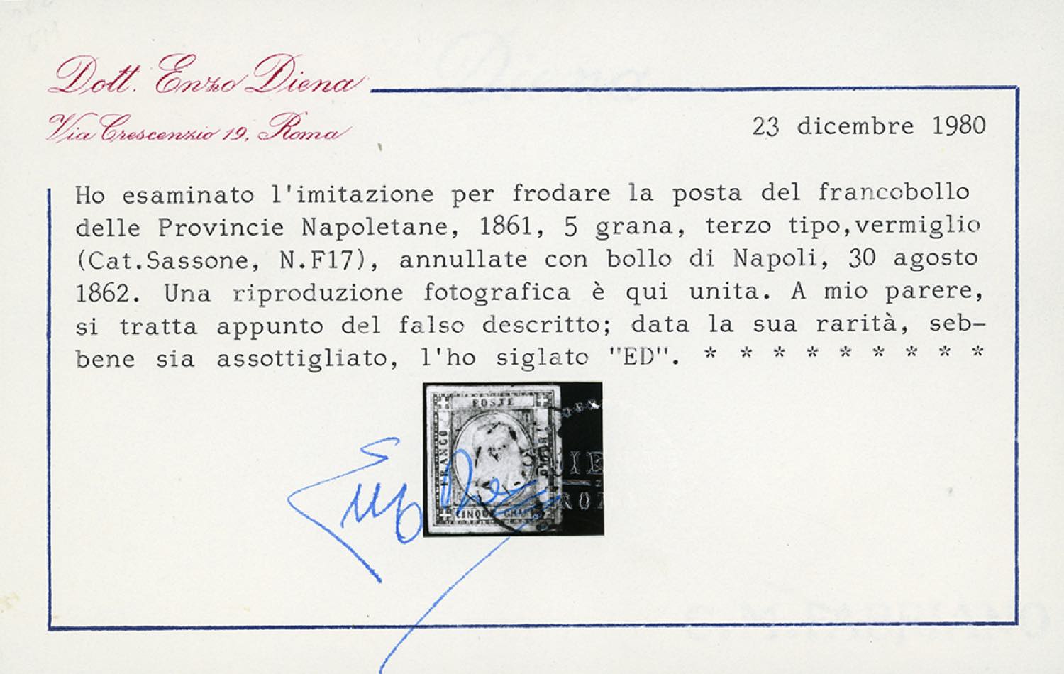 1861 - 5 grana vermiglio, falso per posta, III tipo, effigie C (F4), usato a Napoli 30/8/1862, assottigliato al verso. Raro e di ottimo aspetto. Cert. E.Diena.