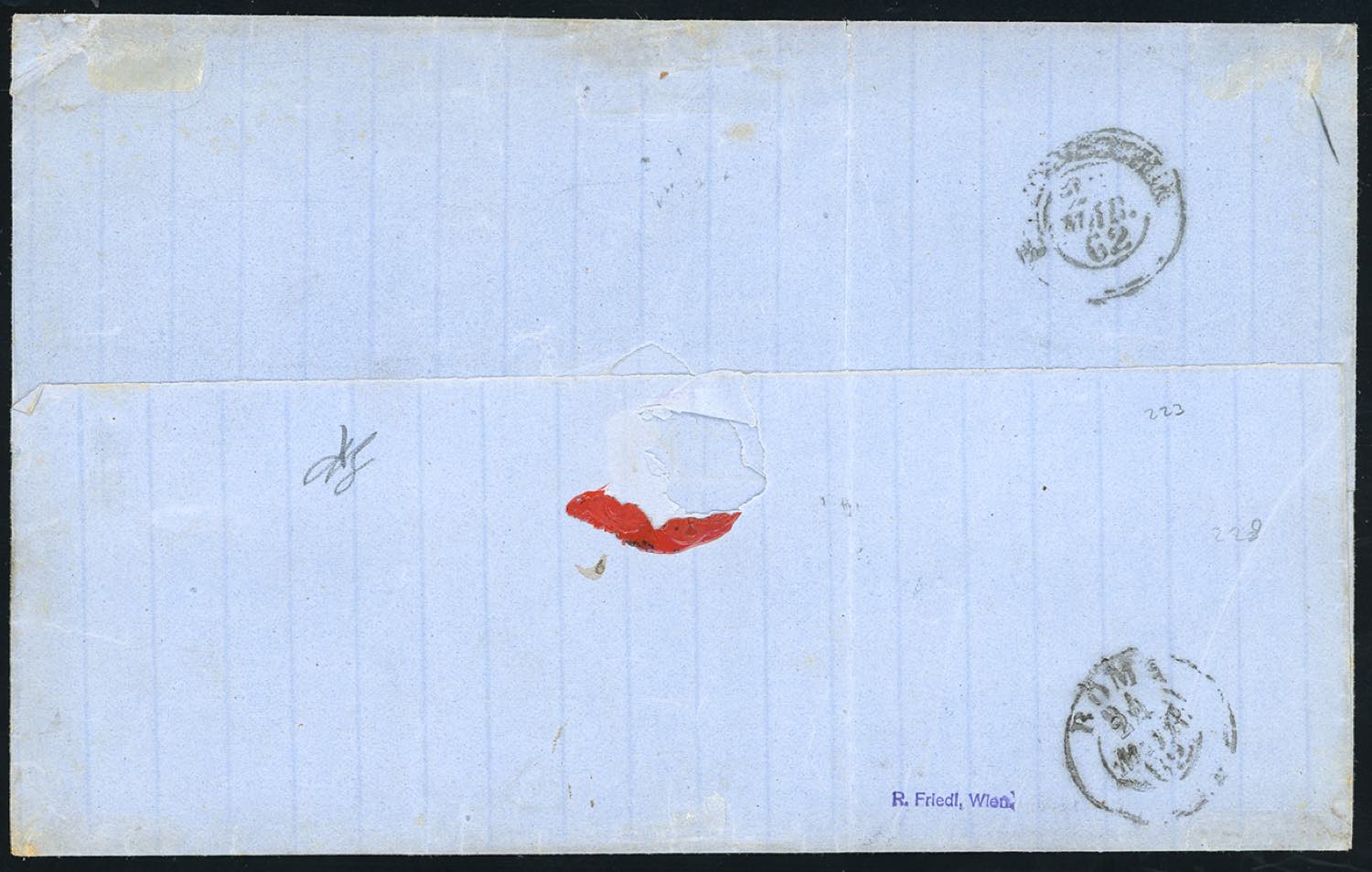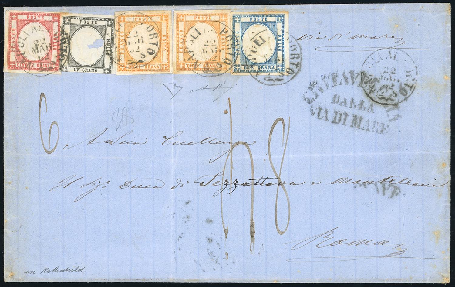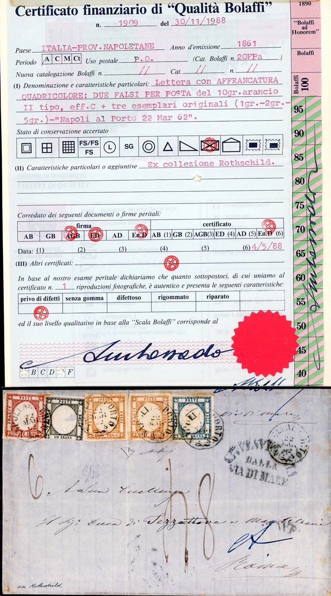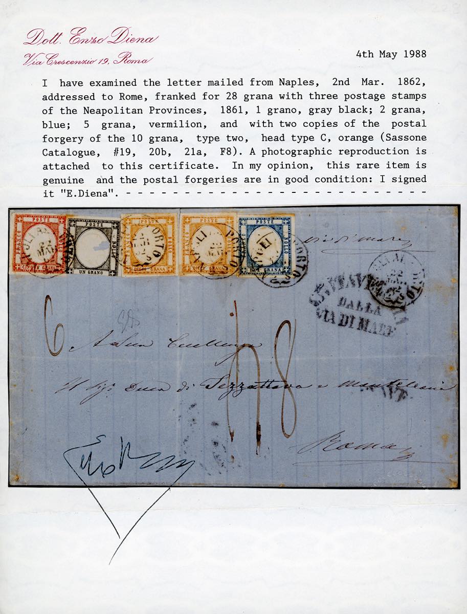 1862 - 10 grana arancio, II tipo, effigie C, falso per posta, due esemplari, perfetti, 1 grana nero, difettoso, 2 grana azzurro, 5 grana rosso carminio, ottimo stato (F8,19,20,21), su sovracoperta di lettera da Napoli 2/3/1862 a Roma, tassata 48 grana. Eccezionale affrancatura multipla con un falso per posta. UNICA. Em.Diena, cert E.Diena e Bolaffi. Ex coll. Rothschild e Imperato.