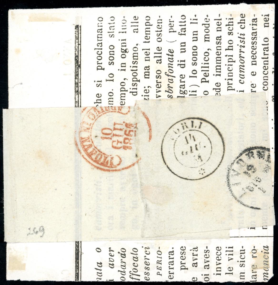 CAMPOBASSO, doppio cerchio grande rosso punti R2 - 1/2 tornese (17a), perfetto, isolato su fascetta con parte di giornale del 6/6/1861 per ... Read more