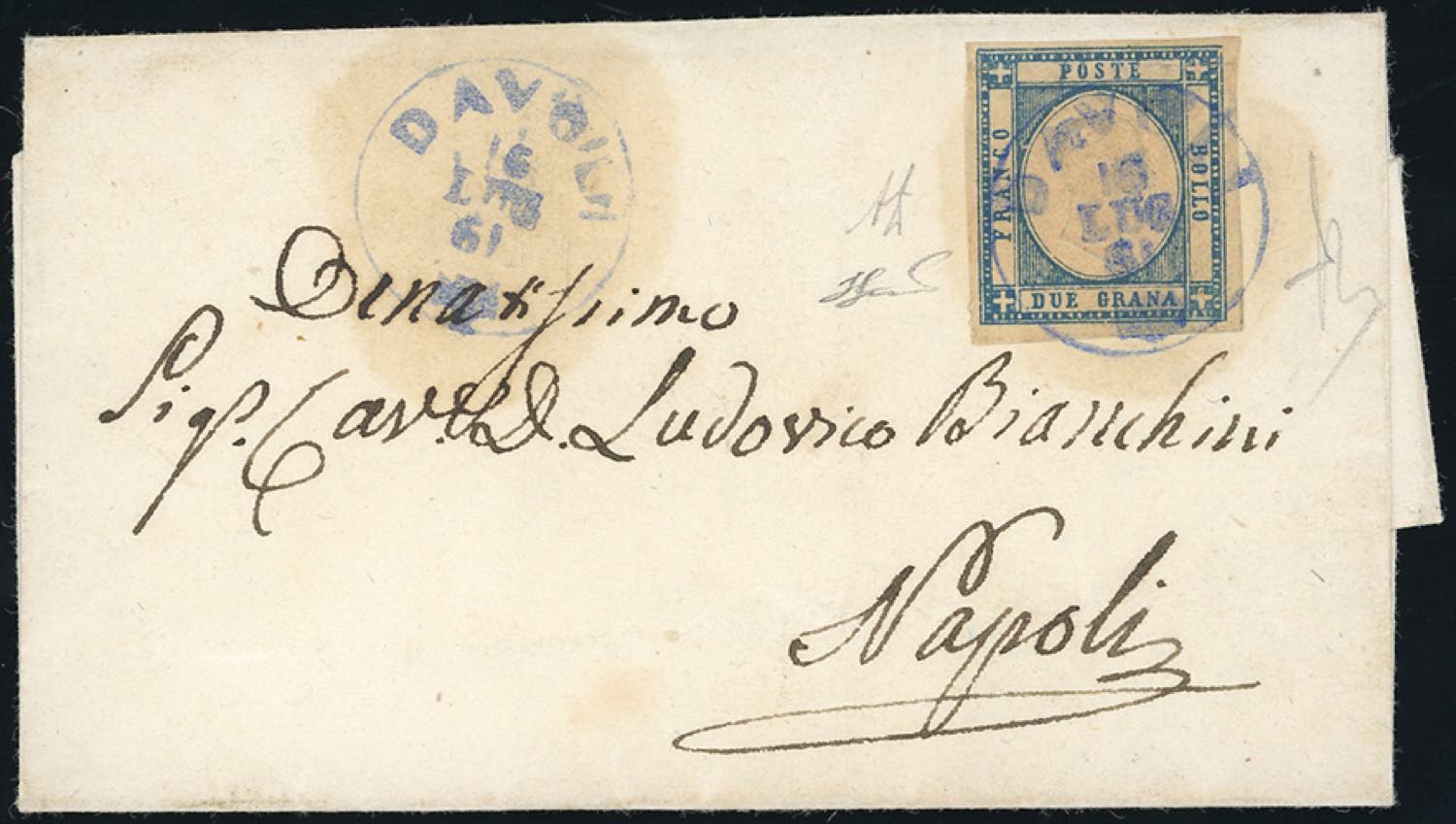 DAVOLI, cerchio piccolo azzurro punti 9 - 2 grana (20d), ottimo stato, su sovracoperta di lettera del 16/7/1861 a Napoli. A.Diena, Ferrario. Ex coll. Imperato.