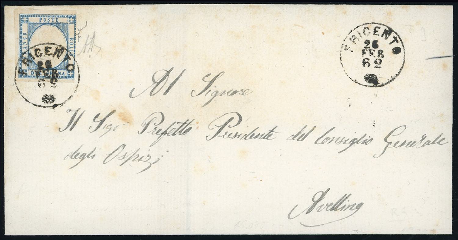 FRIGENTO, cerchio piccolo punti 10 - 2 grana (20), corto a destra, su sovracoperta di lettera del 26/2/1862 ad Avellino. Raro annullo, ... Read more