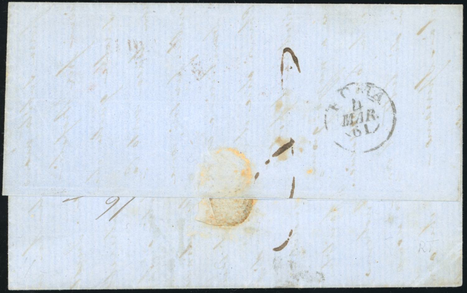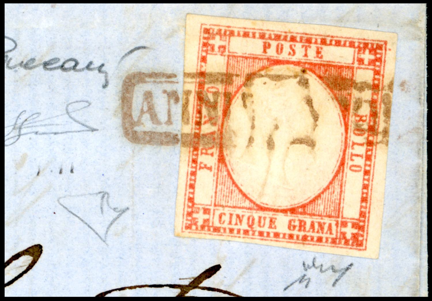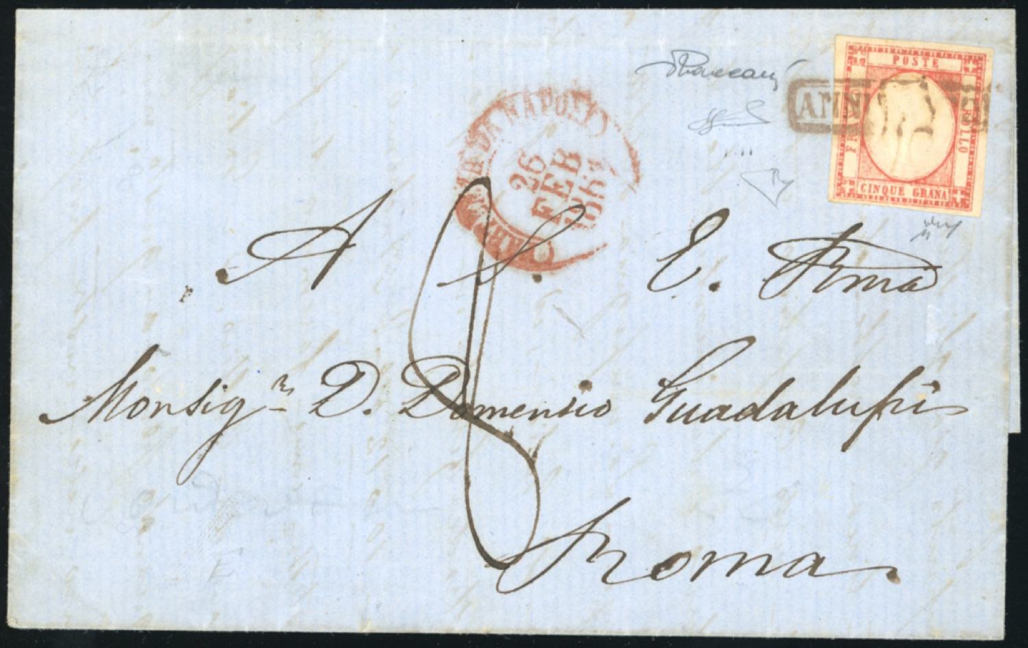 NAPOLI, annullato brunastro + cerchio rosso punti 12 - 5 grana (21a), perfetto, su sovracoperta di lettera del 26/2/1861 per Roma, tassata ... Read more