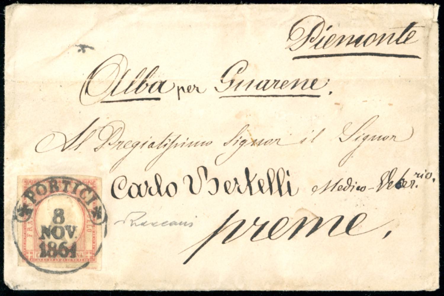 PORTICI, cerchio punti 6 - 5 grana (21), perfetto, su busta del 8/11/1861 a Guarene, Alba. Vaccari. Ex coll. Imperato.