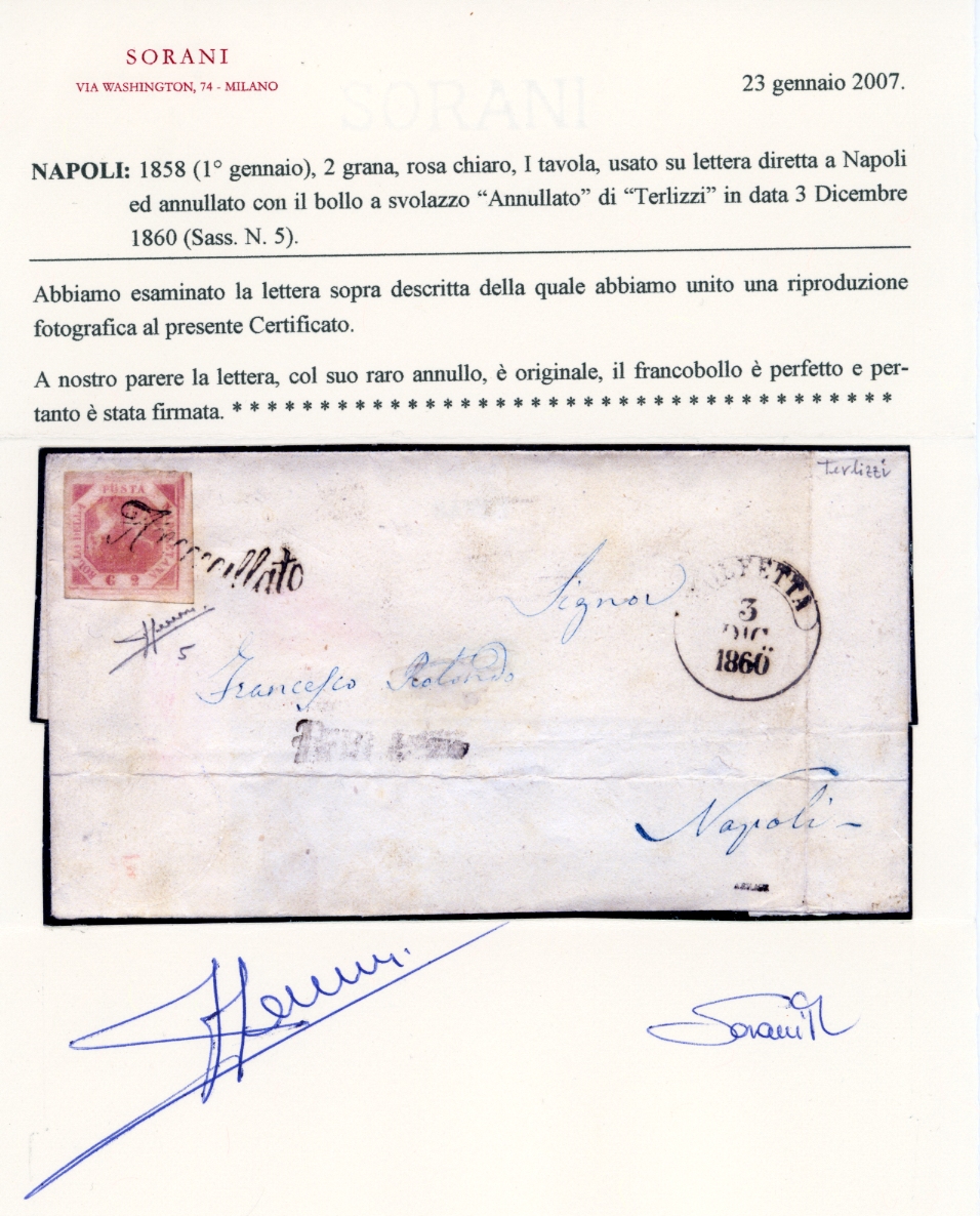 TERLIZZI, lineare + svolazzo e cerchio di Molfetta punti 13 - 2 grana (5), perfetto, su sovracoperta di lettera del 3/12/1860 per Napoli. Rara lettera in periodo di Luogotenenza di Carlo Farini. Cert. Sorani.