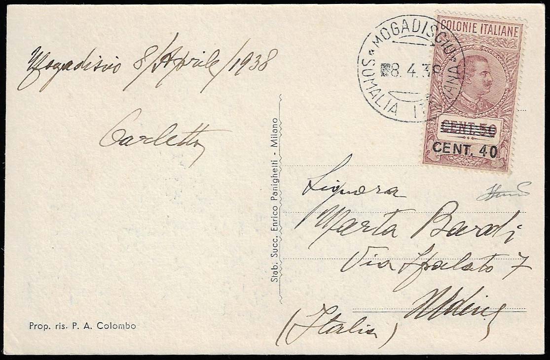 1938 - 40 cent. su 50 cent. marca da bollo, perfetto, su cartolina da Mogadiscio 8/4/1938 per Udine. Raro uso della marca fiscale per posta. Ferrario.
