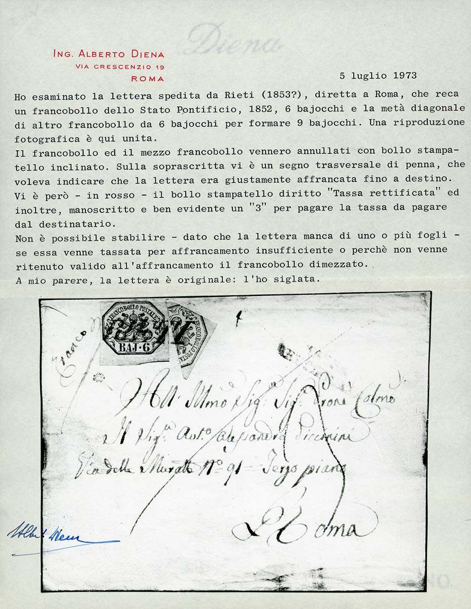 1852 - 6 baj grigio (7a), un esemplare frazionato diagonalmente a metà ed uno intero, su sovracoperta di lettera affrancata insufficientemente da Rieti a Roma, bollo "tassa rettificata" in rosso e tassa 3 baj. Affrancatura rarissima, PROBABILMENTE UNICA! Cert. A.Diena e Vaccari. Ex coll. Imperato.
