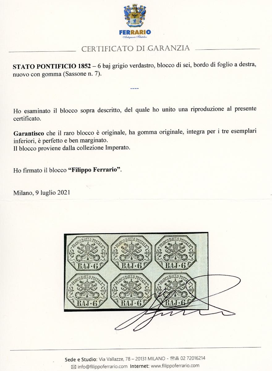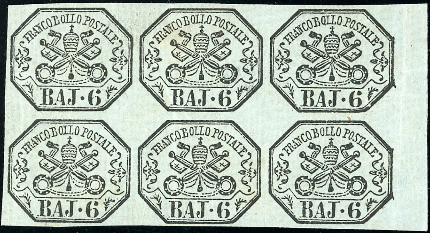 1852 - 6 baj grigio verdastro (7), blocco di sei, bordo di foglio, perfetto e ben marginato, gomma originale, integra per i tre esemplari inferiori, perfetto, minime consuete ossidazioni al verso. Raro e di ottima qualità. Chiavarello, cert. Ferrario. Ex coll. Imperato.