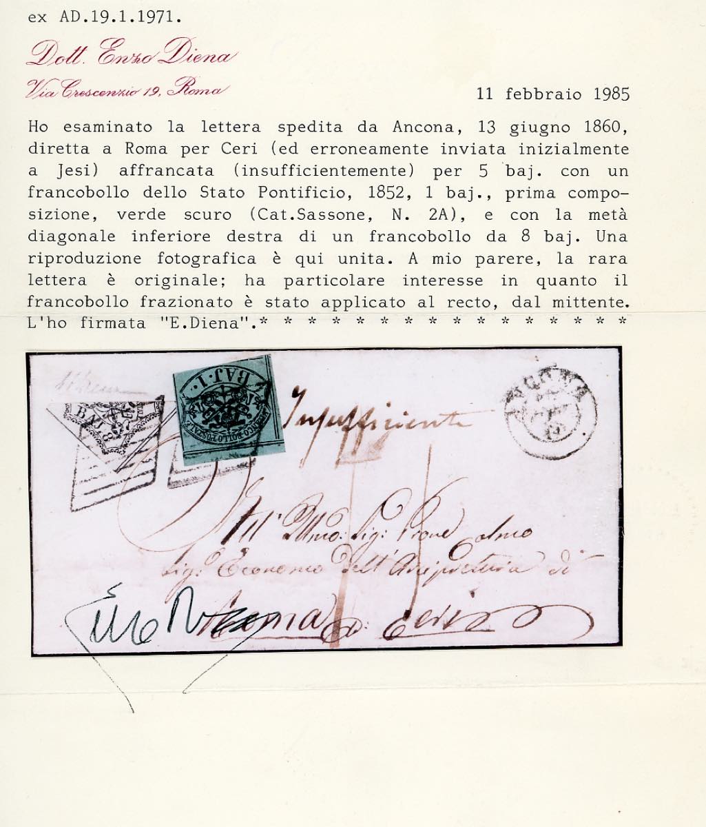 1860 - 8 baj bianco, frazionato diagonalmente a metà, 1 baj verde scuro, I composizione (9,2A), perfetti, su sovracoperta di lettera da Ancona 13/6/1860 a Ceri, inviata inizialmente per errore a Jesi, tassata in arrivo. Rara. A.Diena, cert. E.Diena.