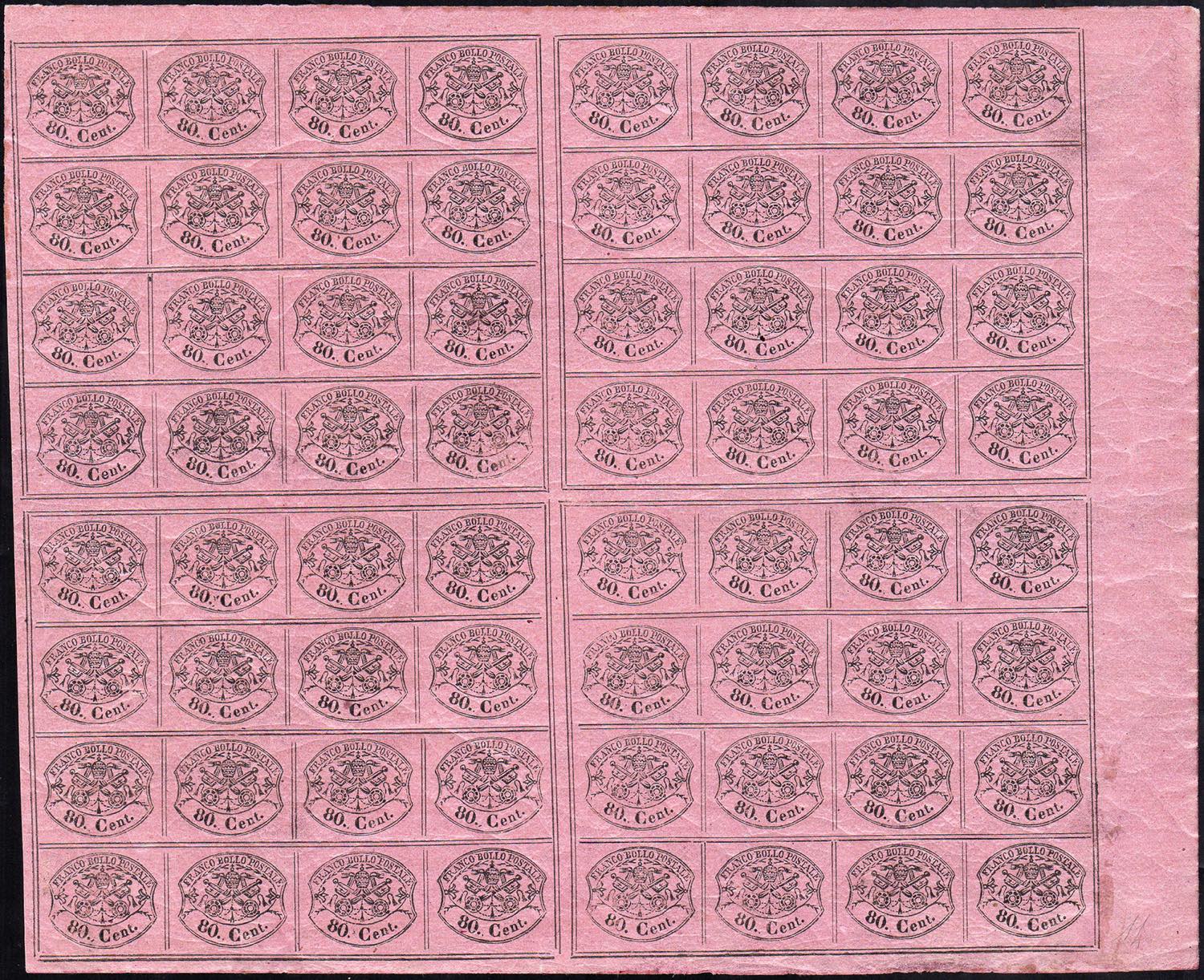 1867 - 80 cent. rosa lillaceo (20), foglio completo di 64 esemplari, gomma originale, integra per 60 esemplari, perfetto. Raro! Ex coll. Tirreno. A.Diena.