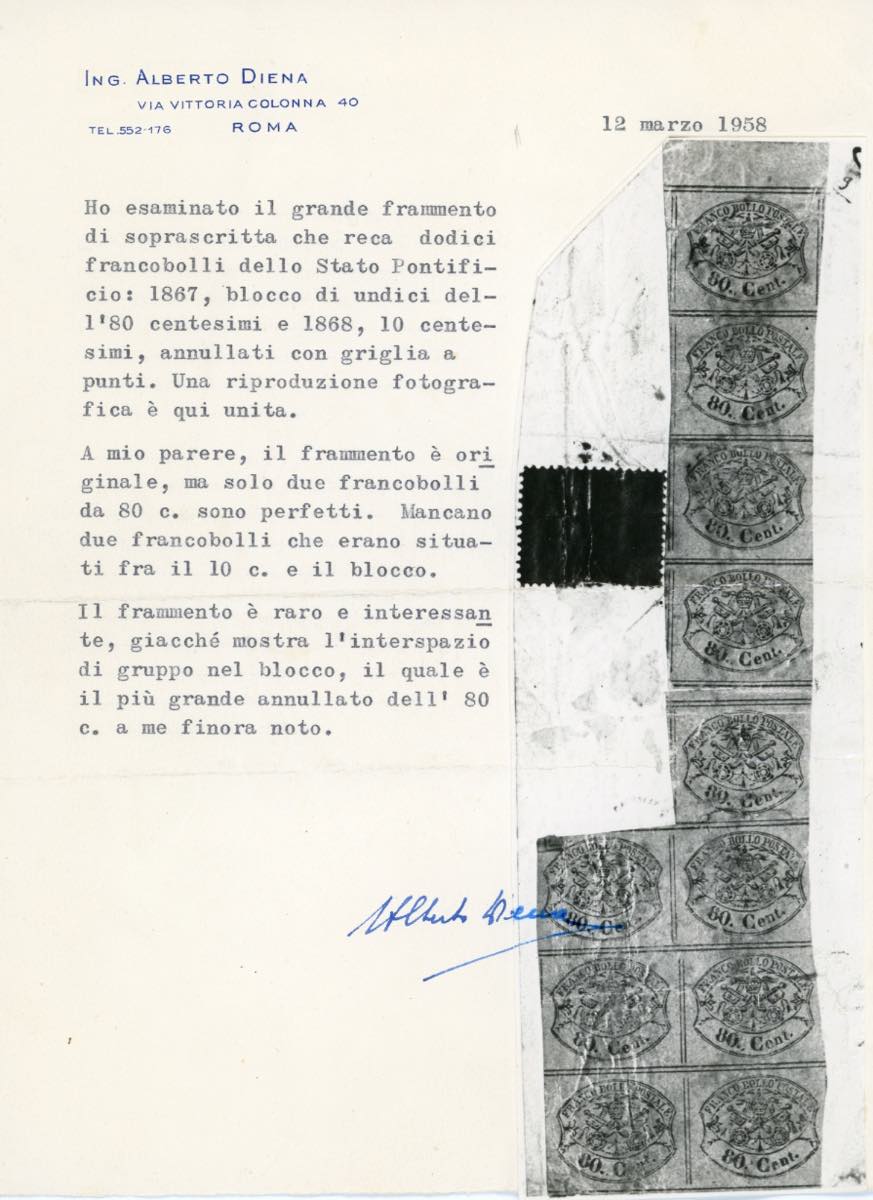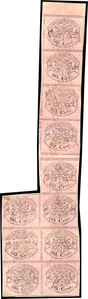 1867 - 80 cent. rosa lillaceo (20), blocco di 11 esemplari, con interspazio di gruppo tra il quarto e il quinto esemplare, usato su frammento. Si tratta del MASSIMO BLOCCO USATO NOTO di questo francobollo, nonché una delle massime affrancature. Cert. A.Diena. Ex coll.Imperato.