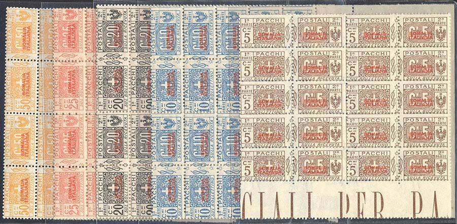 PACCHI POSTALI 1926/31 - Soprastampati in rosso, I tipo, non emessi, cinque valori (43/47), blocchi di dieci, bordo di foglio, gomma ... Read more