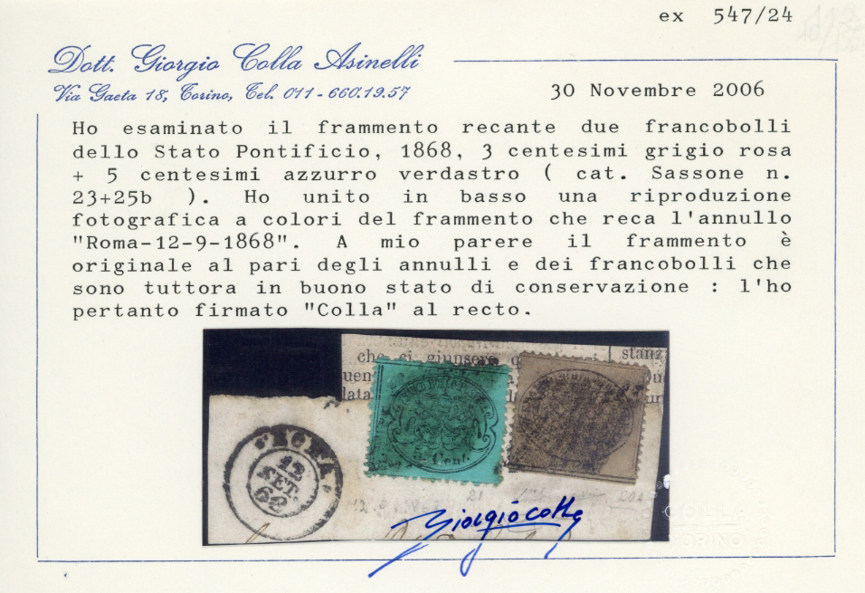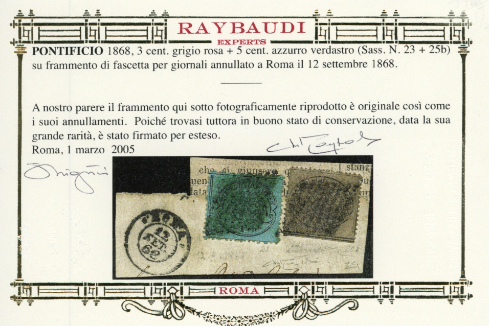 1868 - 3 cent. grigio rosa, 5 cent. azzurro verdastro (23,25b), buono stato, usati su frammento a Roma 12/9/1868. Raro. Cert. Colla e Oro Raybaudi.