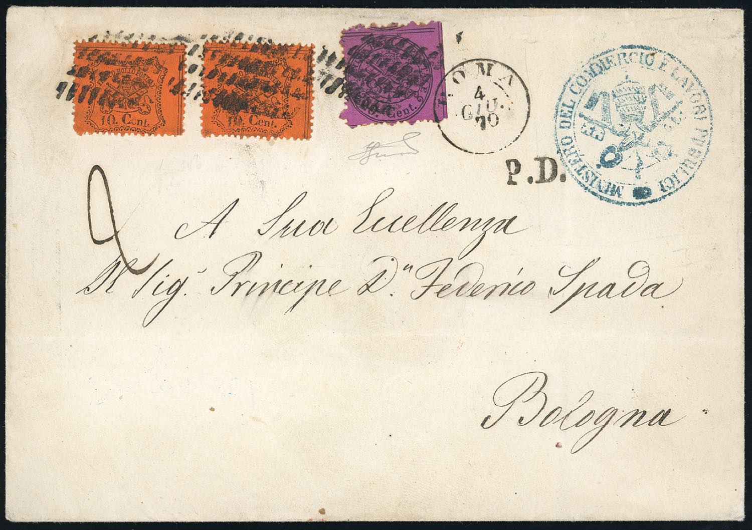 1870 - 10 cent. due esemplari e 20 cent. solferino (26,28), perfetti, su fresca busta di quattro porti da Roma 4/6/1870 a Bologna. Molto bella e non comune affrancatura multipla. Ferrario.