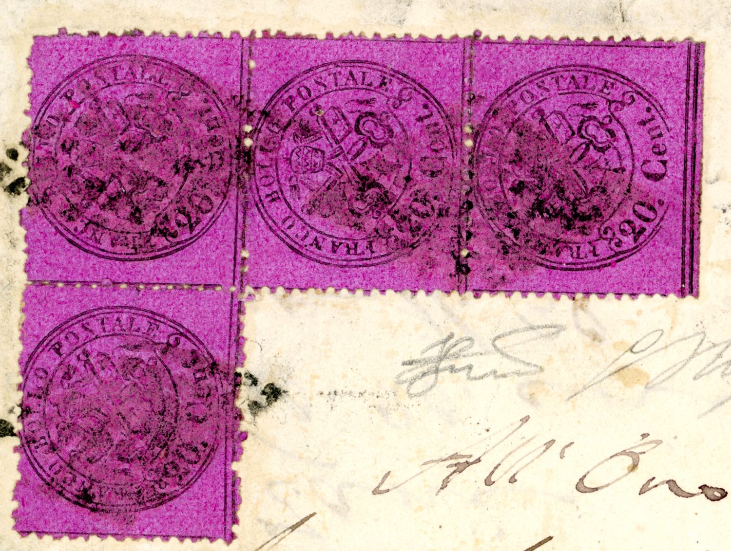 1870 - 20 cent. solferino (28), striscia verticale di tre, margine di foglio inferiore, ed esemplare singolo, perfetti, su fresca lettera ... Read more