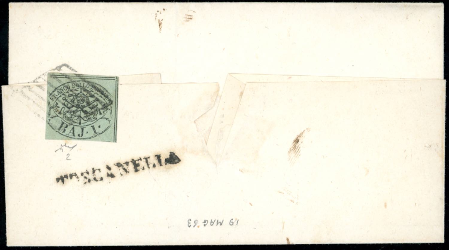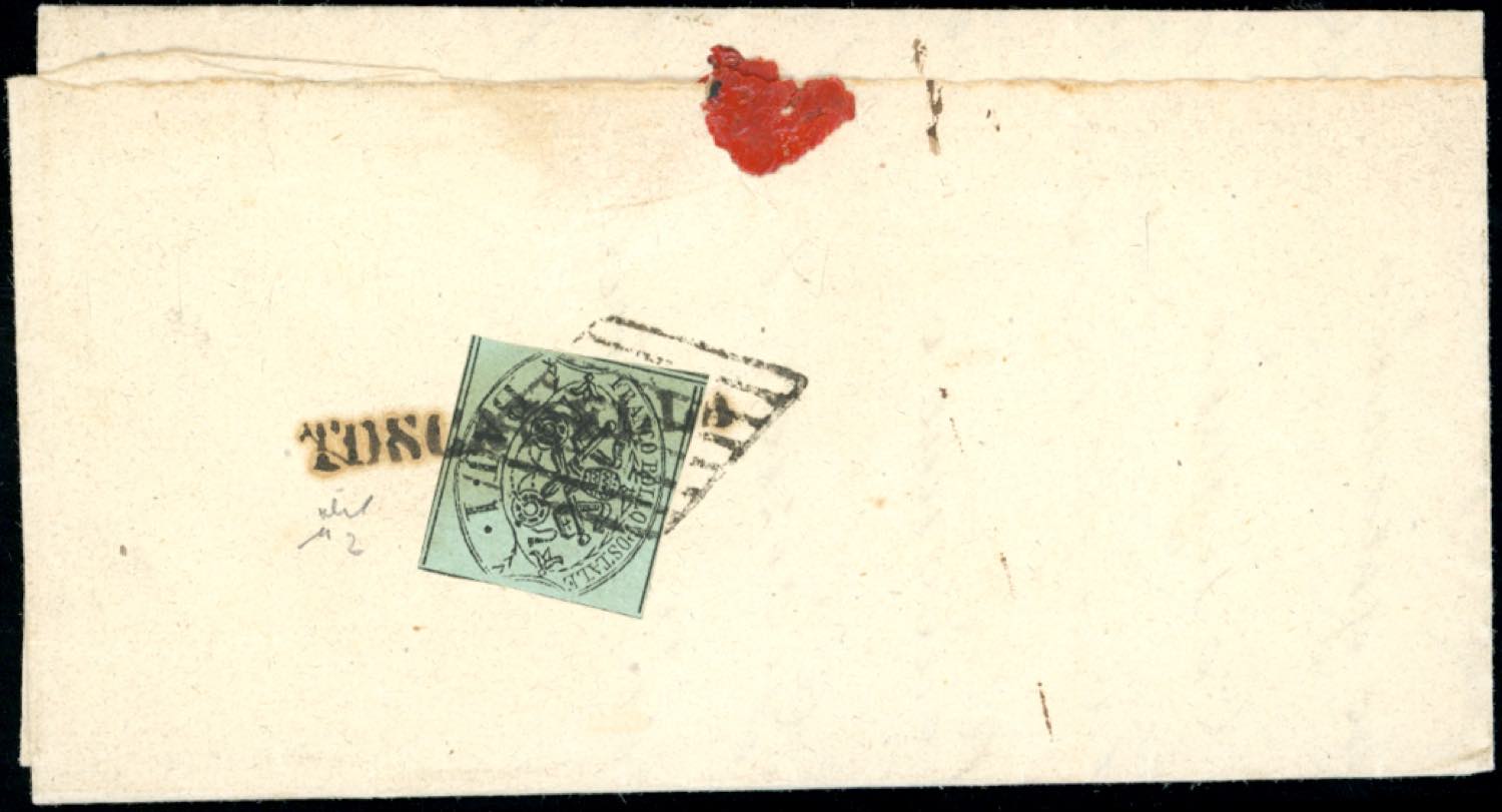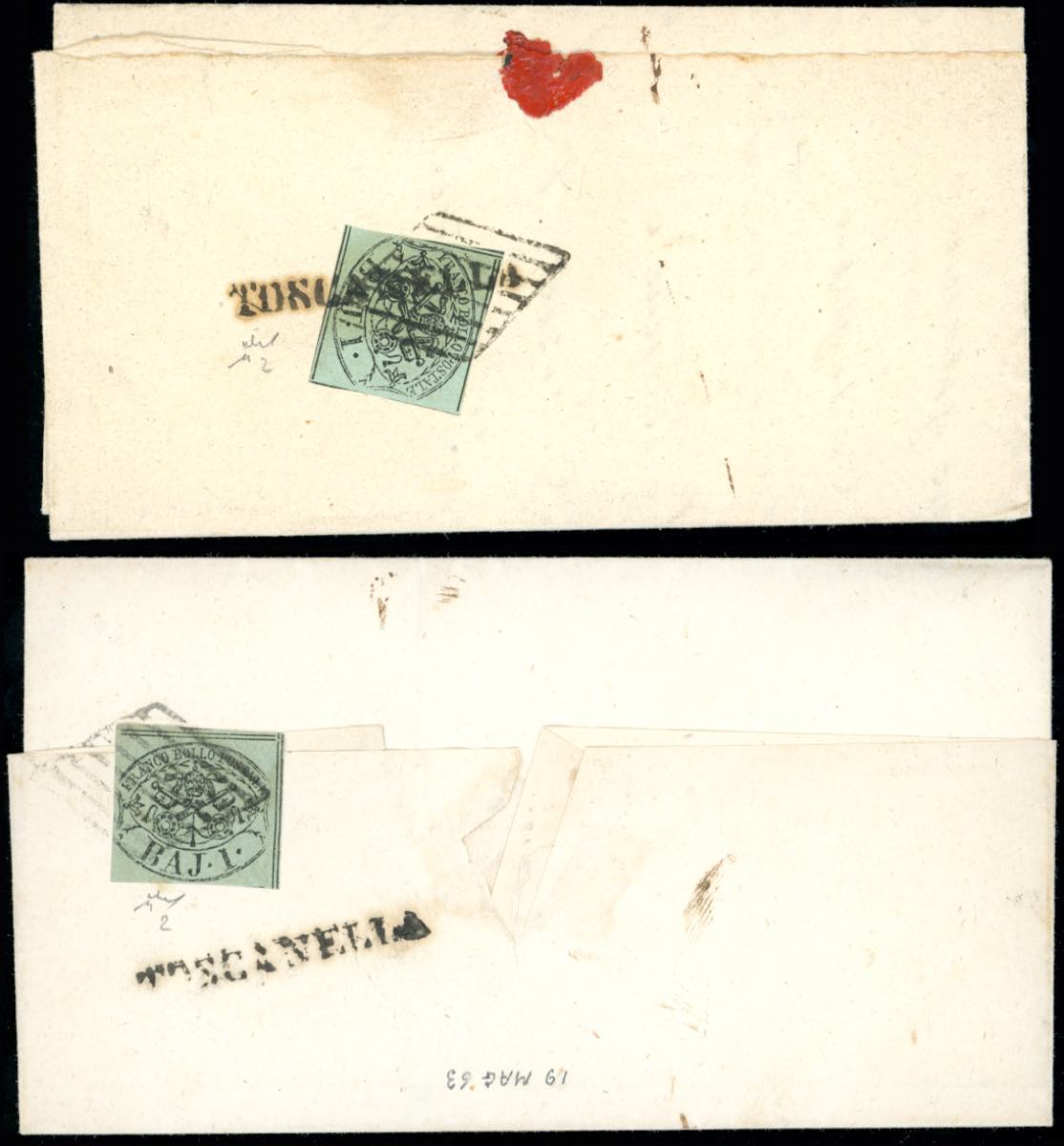 TOSCANELLA, SD + griglia coannullatori, combinazione non catalogata - 1 baj (2), perfetto, al verso di sovracoperta di lettera in porto assegnato del 8/12/1858 per Viterbo, tassata 1 baj. Allegata analoga lettera con bolli affiancati. Chiavarello. Ex coll. Imperato.
