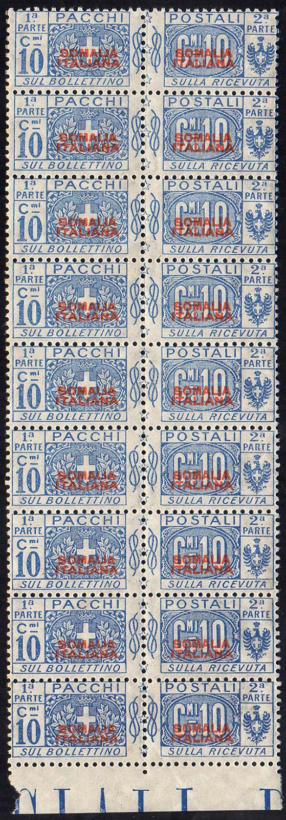 PACCHI POSTALI 1926 - 10 cent. soprastampa rossa, I tipo, non emesso (44), striscia di 9, gomma integra, perfetta. Bella!