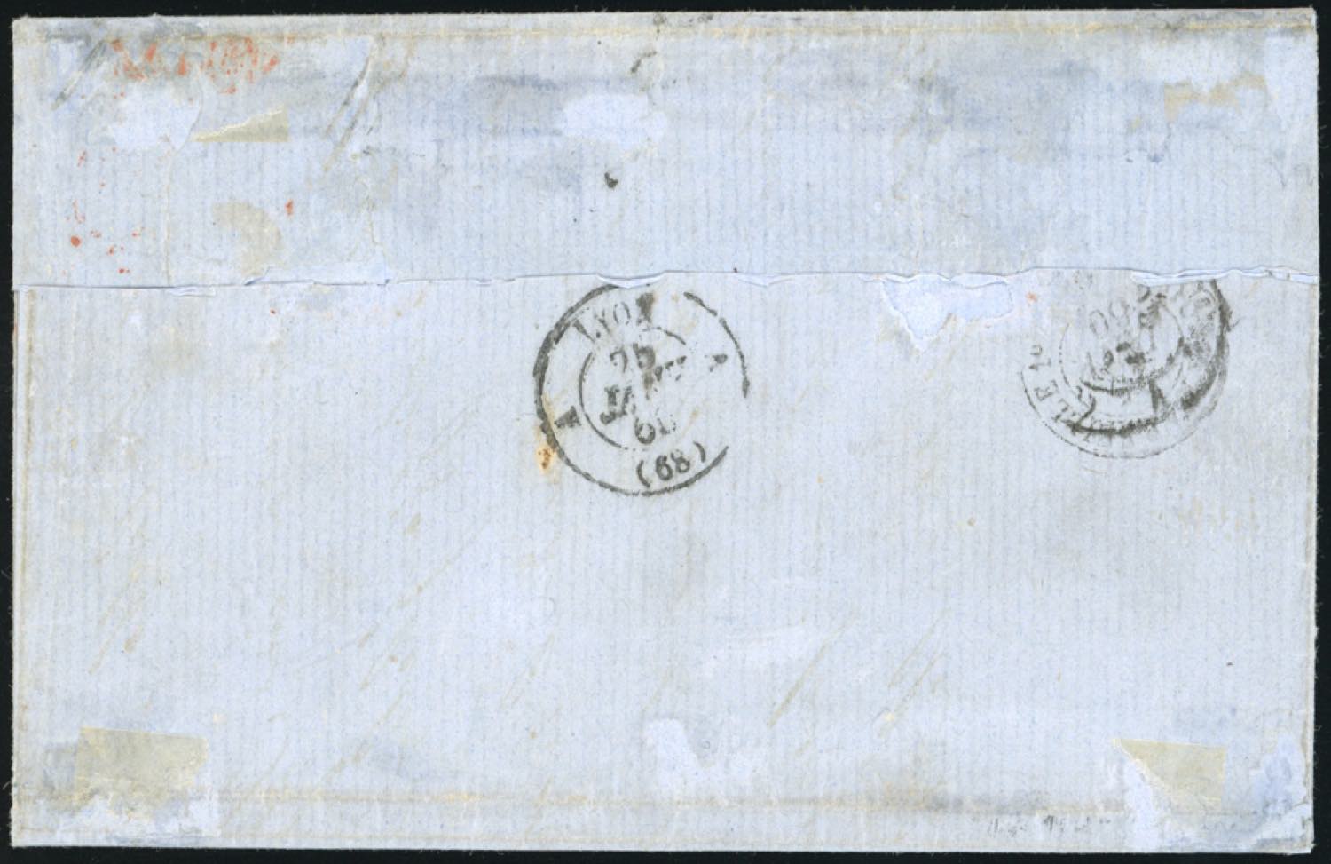 1860 - 20 baj grigio azzurro (9), due esemplari, perfetti, su sovracoperta di lettera di doppio porto da Bologna 21/1/1860 a Marsiglia. ... Read more