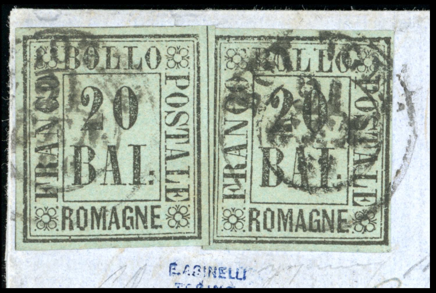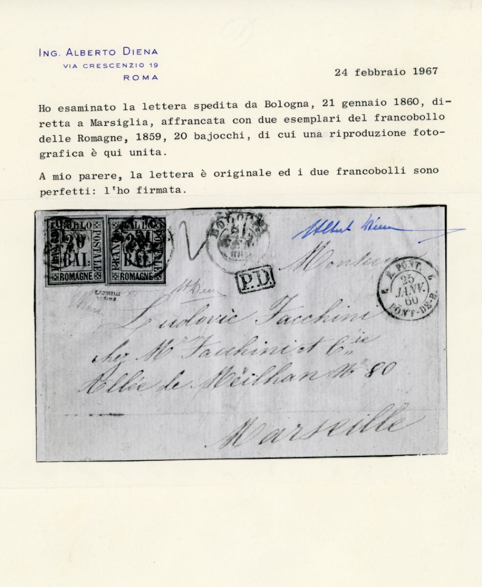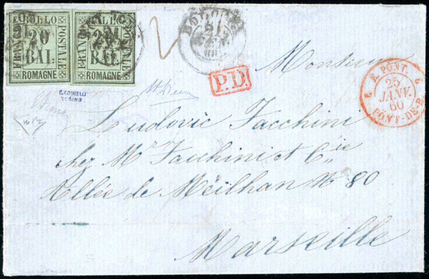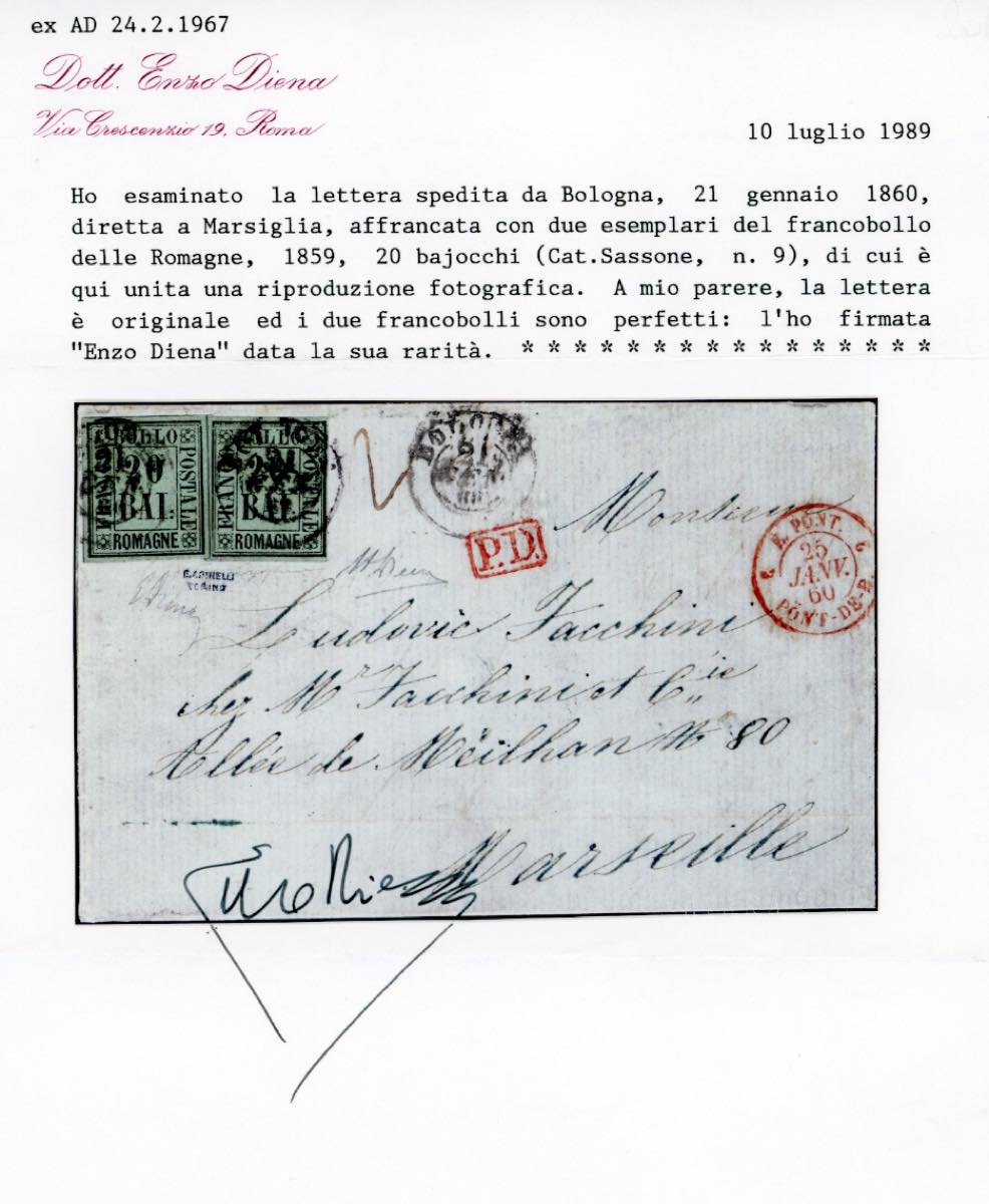 1860 - 20 baj grigio azzurro (9), due esemplari, perfetti, su sovracoperta di lettera di doppio porto da Bologna 21/1/1860 a Marsiglia. Estremamente rara, impreziosita dall'annullo nominativo sui francobolli. Em.Diena, cert. A. ed E.Diena.