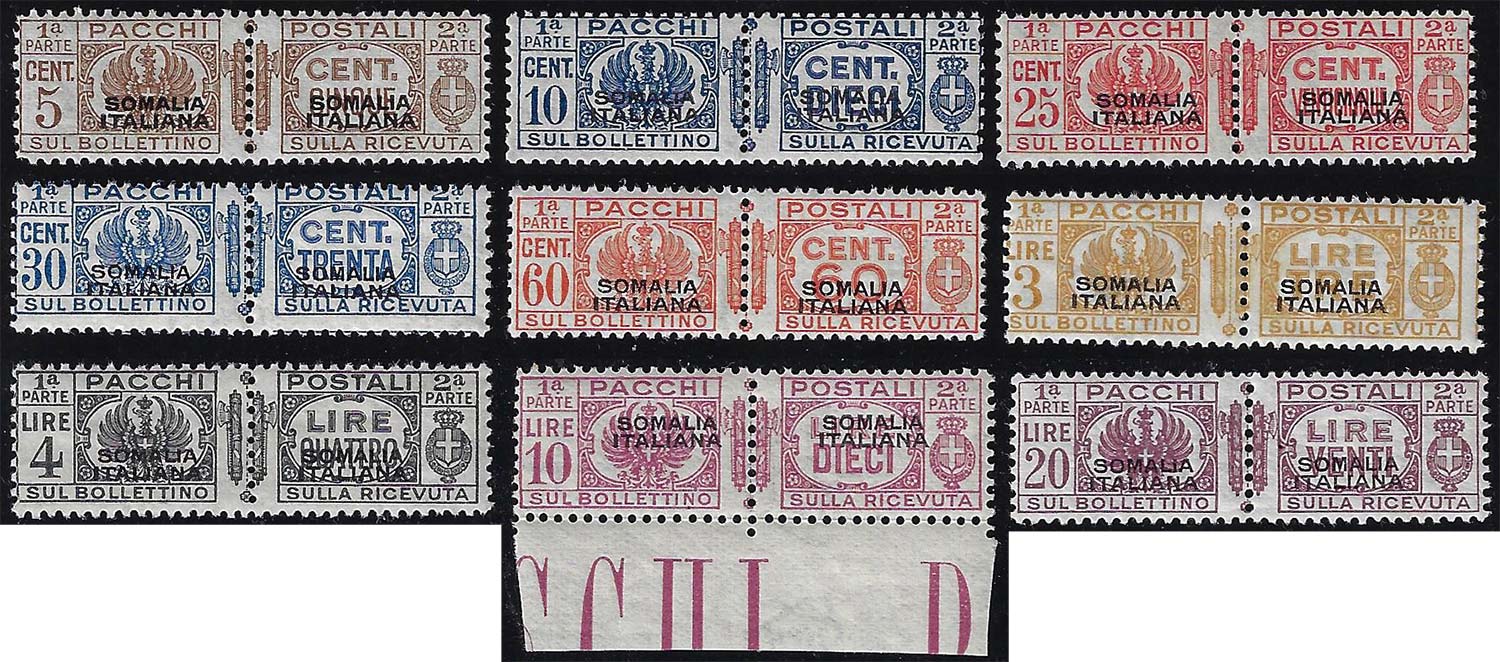 PACCHI POSTALI 1928/41 - Fascio al centro, soprastampa del I tipo nera, nove valori (54/57,59,62/69), gomma originale integra, perfetti. Il ... Read more