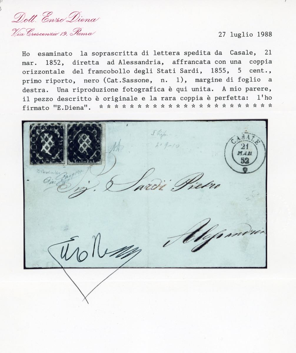 1852 - 5 cent. nero (1), coppia orizzontale, perfetta e ben marginata, su frontespizio di lettera da Casale 21/3/1852 ad Alessandria. Insieme raro e di ottima qualità. A.Diena, Gaggero, cert. E.Diena.