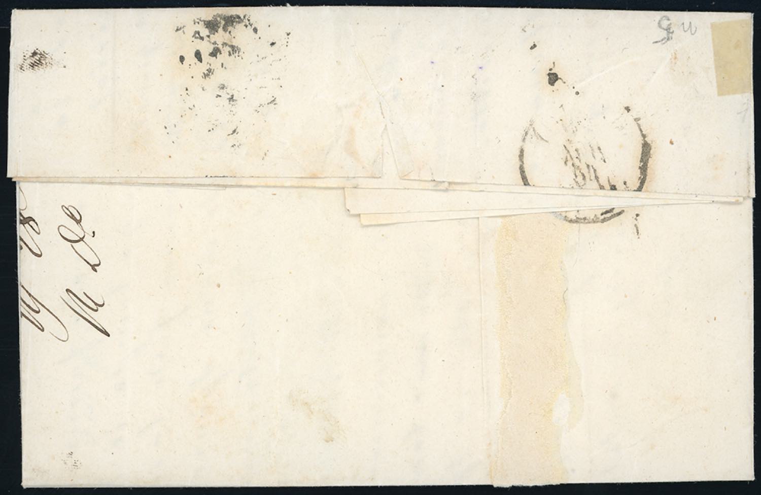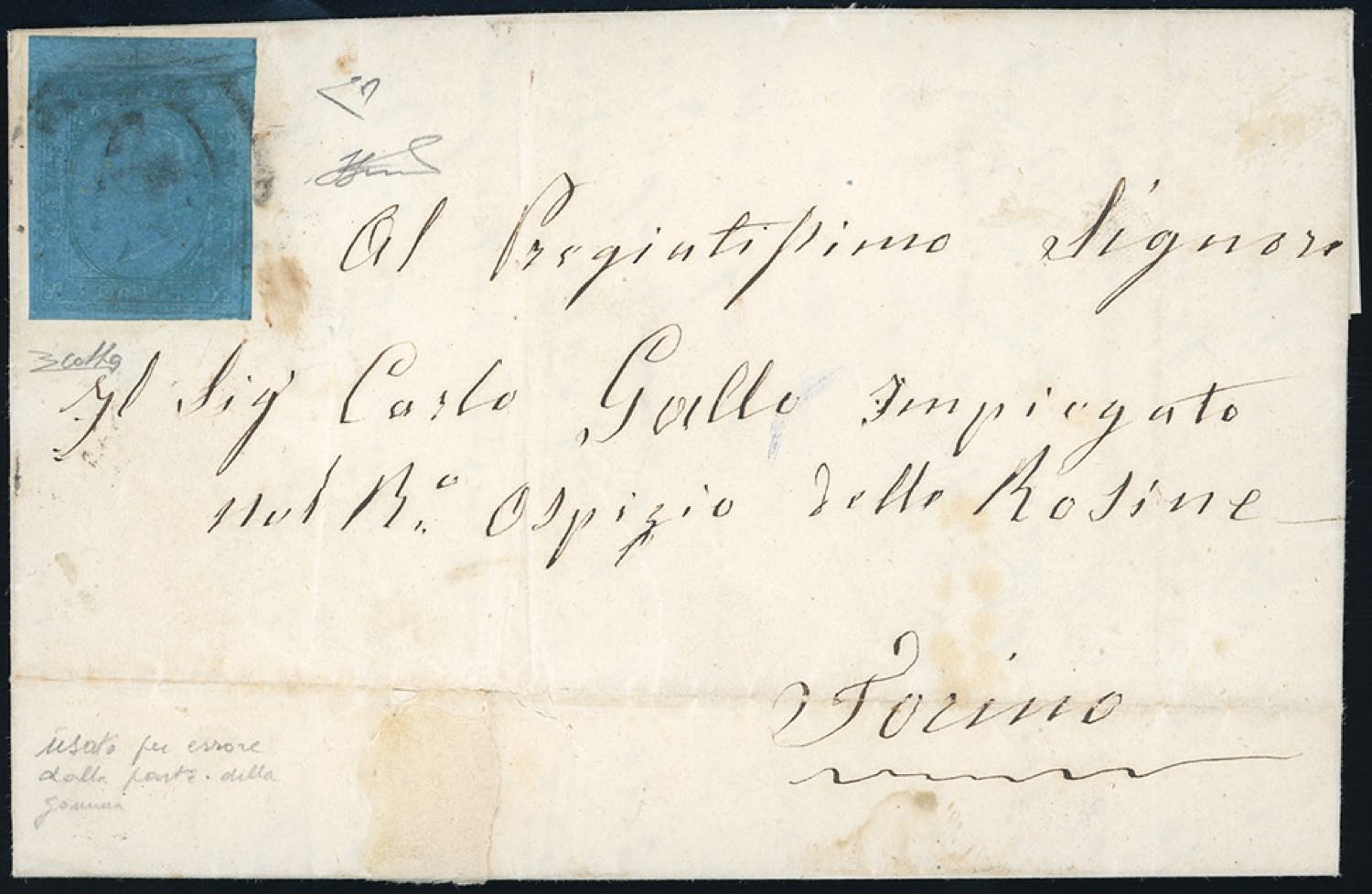 1854 - 20 cent. azzurro (5), APPLICATO PER ERRORE DALLA PARTE DELLA GOMMA, perfetto, su lettera da Sordevolo 27/4/1854 a Torino. Rarità dell'emissione, del quale si conosce solo un altro caso. Colla, cert. E.Diena e Ferrario.
