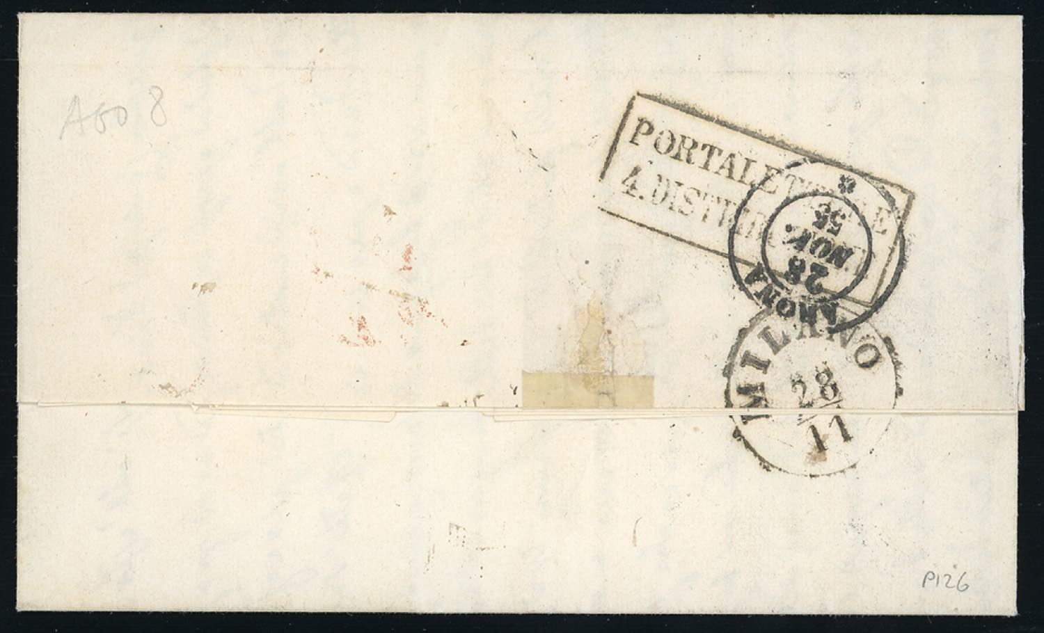 1855 - 5 cent. verde, 20 cent. azzurro (7,8), perfetti e ben marginati, su lettera da Arona 28/11/1855 a Milano, bollo P.D. rosso. ... Read more