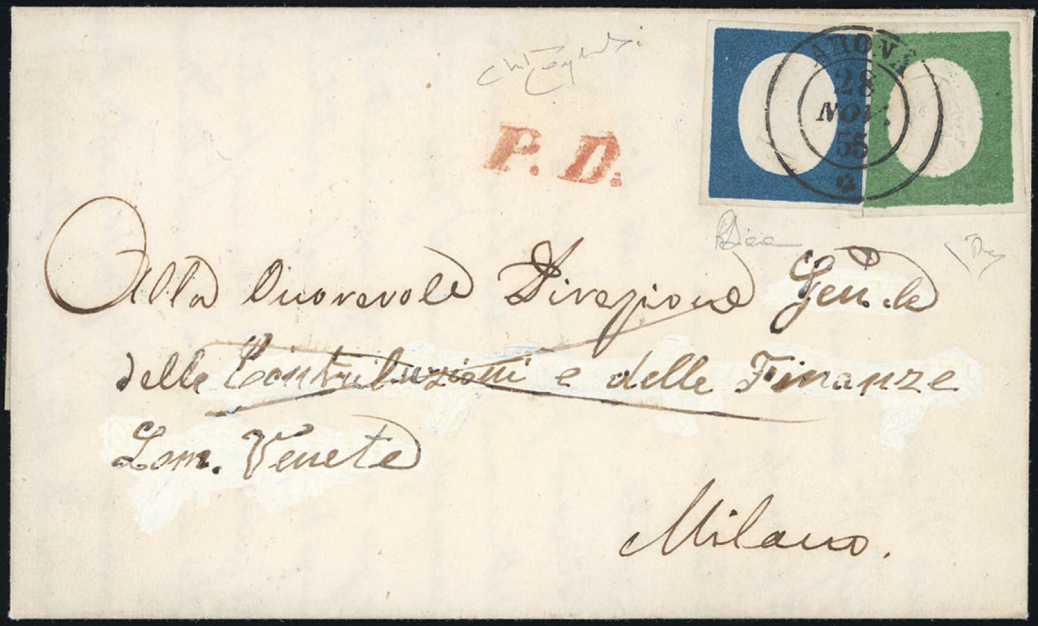 1855 - 5 cent. verde, 20 cent. azzurro (7,8), perfetti e ben marginati, su lettera da Arona 28/11/1855 a Milano, bollo P.D. rosso. Splendida e di eccezionale freschezza. R.Diena, Raybaudi, cert. E.Diena.
