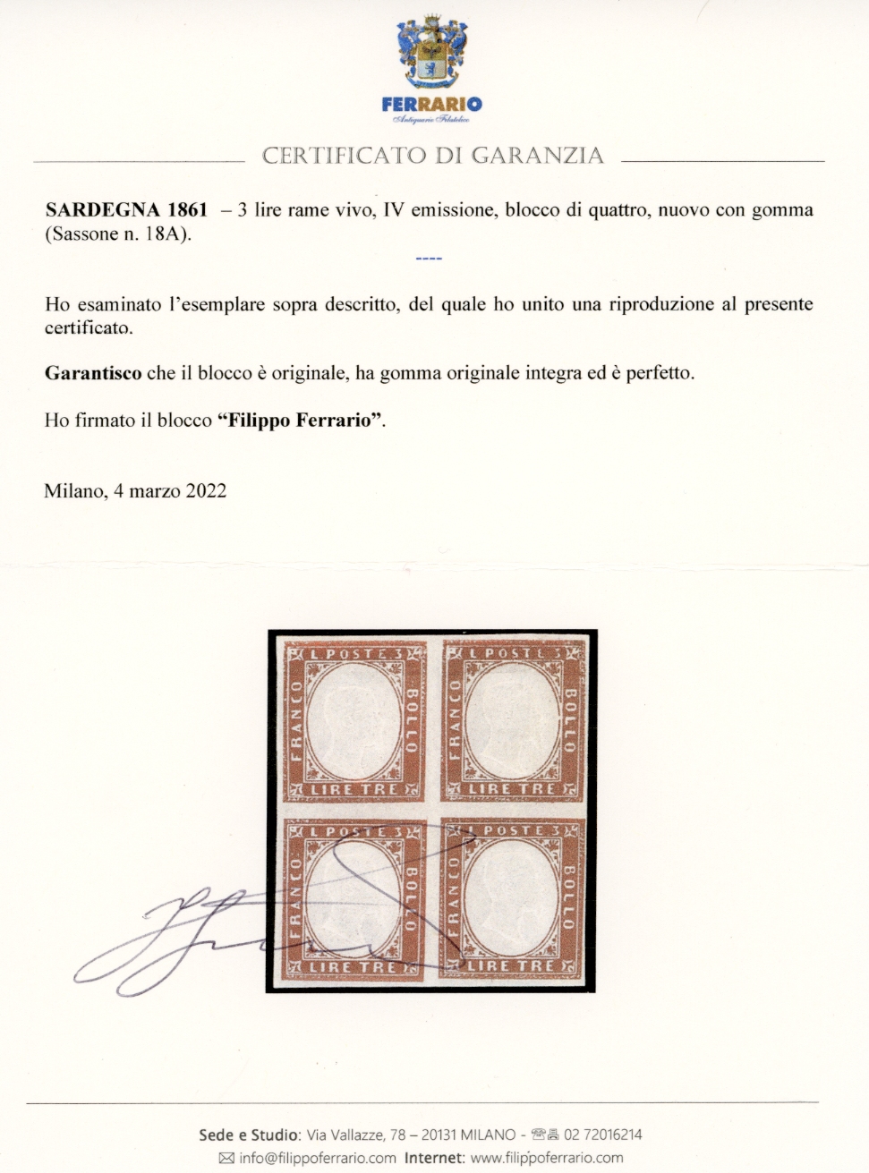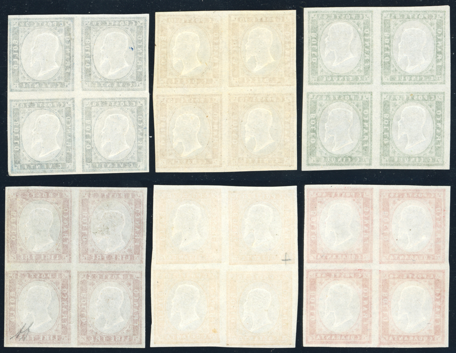 1863 - IV emissione, serie completa, tinte più comuni (13E/18A), blocchi di quattro, nuovi, gomma originale integra, perfetti. Molto freschi. A.Diena e cert. Ferrario per il 3 lire.