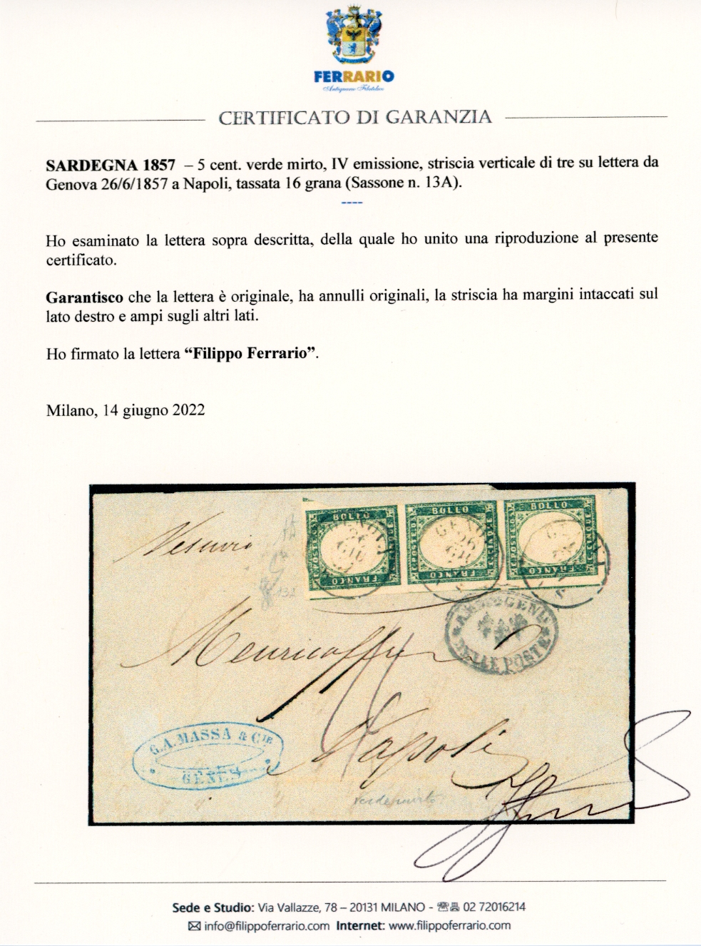 1857 - 5 cent. verde mirto (13A), striscia verticale di tre, in parte intaccata a destra, ampi gli altri margini, su lettera da Genova 26/6/1857 a Napoli, tassata 16 grana. Rara e di buon aspetto. A.Diena, cert. Ferrario.