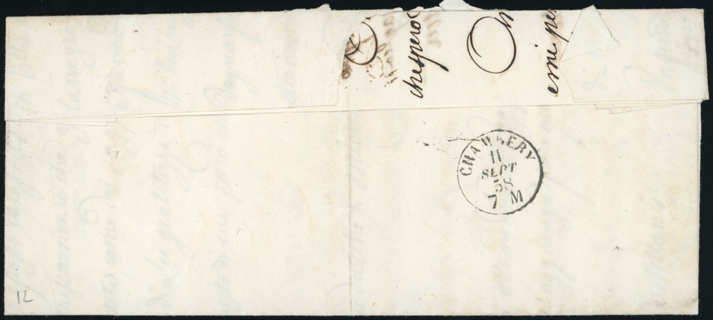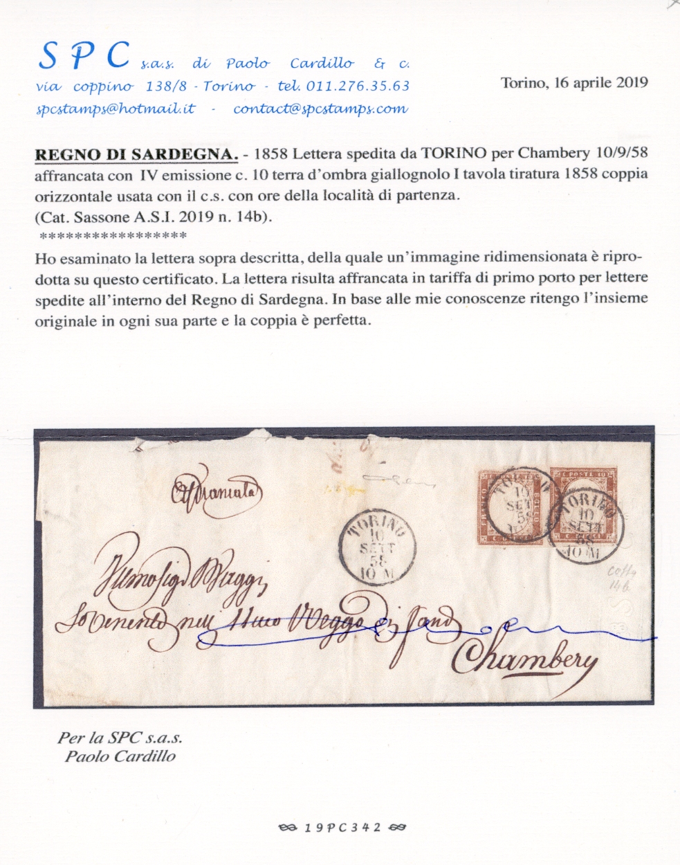 1858 - 10 cent. terra d'ombra giallognolo (14b), coppia, perfetta, su lettera da Torino 10/9/1858 a Chambery, indirizzata ad un militare. Colla, cert. Cardillo.