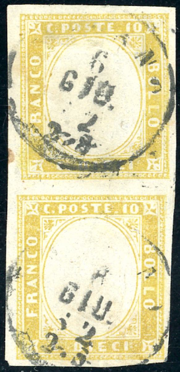 1862 - 10 cent. giallo olivastro (14Dc), coppia verticale, perfetta, usata a Milano. Rara tonalità. Cert. Ferrario.