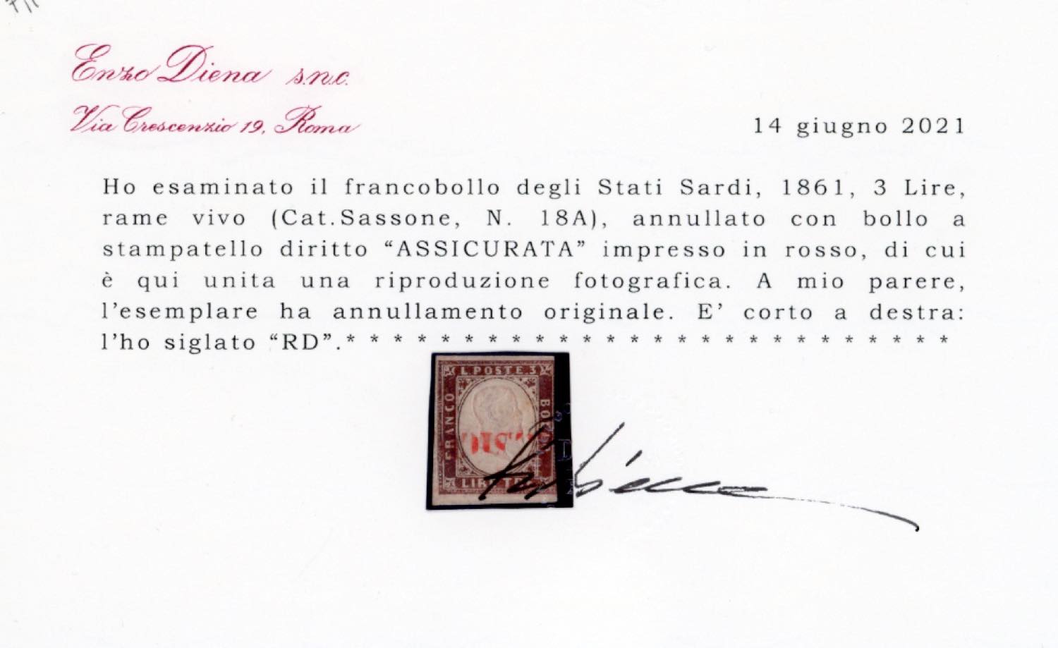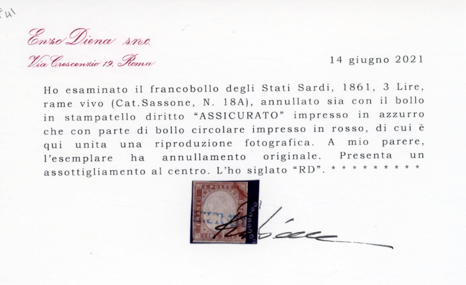 1861 - 3 lire rame, un esemplare e 3 lire rame vivo, quattro esemplari (18,18A), TUTTI USATI CON ANNULLI DI RACCOMANDAZIONE, con varie tonalità di colore. Tre con lievi difetti. Insieme eccezionale da esposizione. Ex collezione Imperato. Cinque certificati Diena, un certificato Bottacchi.