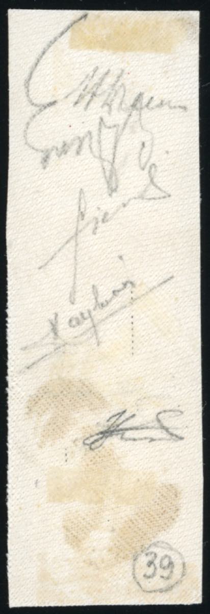 1863 - 3 lire rame, 10 cent. bistro, due esemplari (18,14E), perfetti, usati su piccolo frammento a Torino 11/8/1863. Molto raro. Em. Ed ... Read more