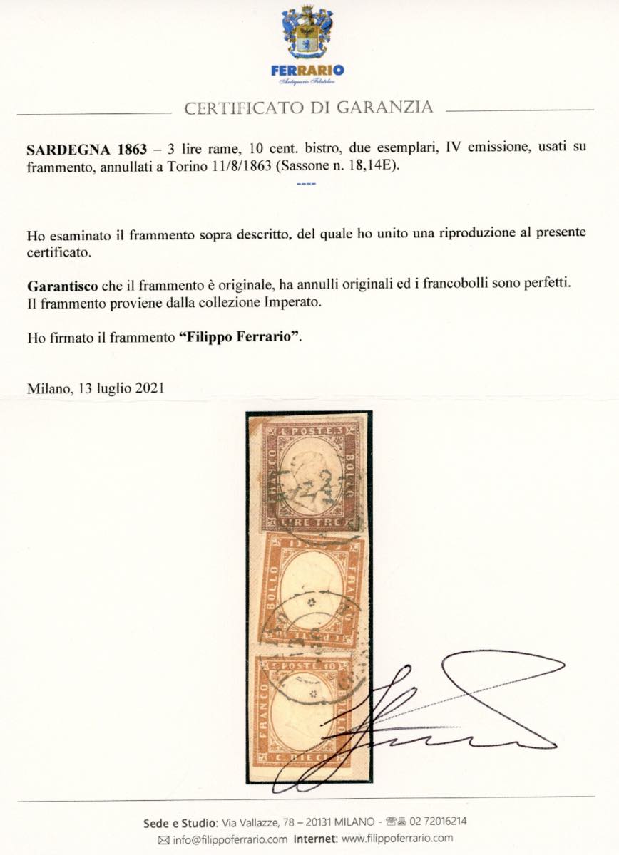 1863 - 3 lire rame, 10 cent. bistro, due esemplari (18,14E), perfetti, usati su piccolo frammento a Torino 11/8/1863. Molto raro. Em. Ed A.Diena, Raybaudi, Fiecchi, cert. Ferrario. Ex. Coll. Imperato.