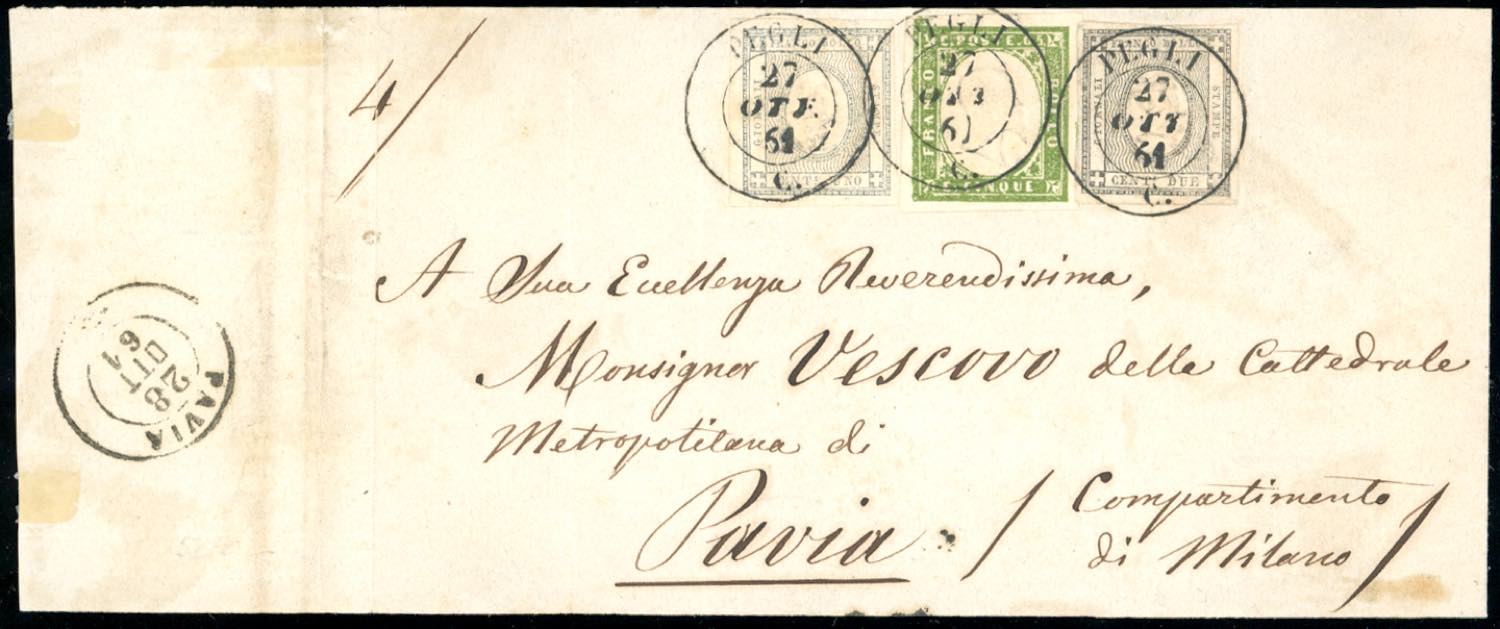 1861 - 1 cent. grigio verdastro, 2 cent. grigio nero per stampati, 5 cent. verde oliva (19b,20,13c), perfetti e ben marginati, gran parte di fascetta di quattro porti con bollo d'arrivo al verso da Pegli 27/10/1861 a Pavia. Splendida e rara affrancatura tricolore.