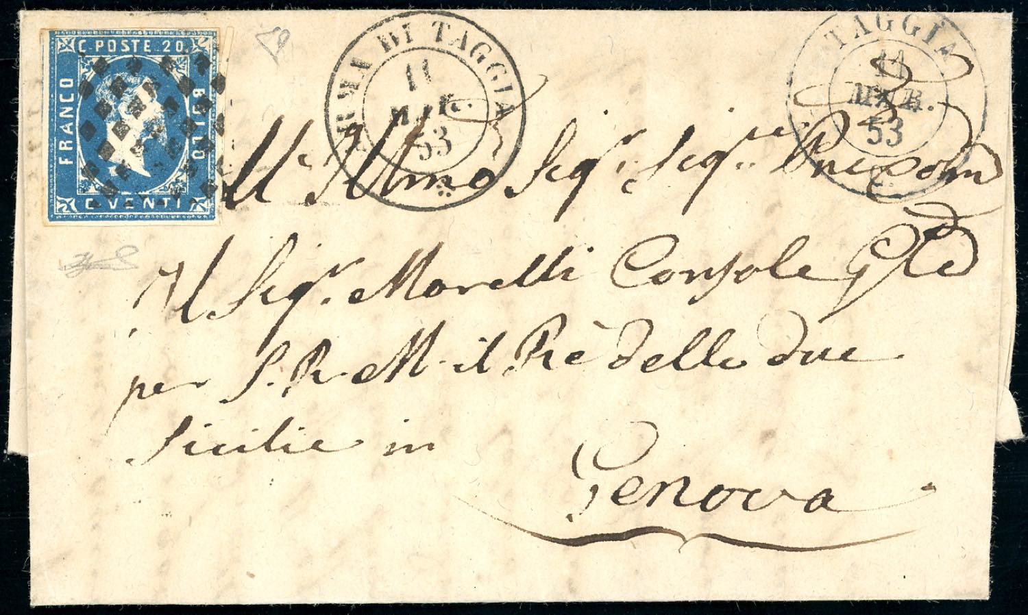ARMA DI TAGGIA, rombo + datario punti R3 - 20 cent. (2), giusto in alto, su lettera del 11/3/1853 a Genova. Fresca e molto rara. E.Diena, cert. Ferrario (cat. Sassone € 36.800/54.300)