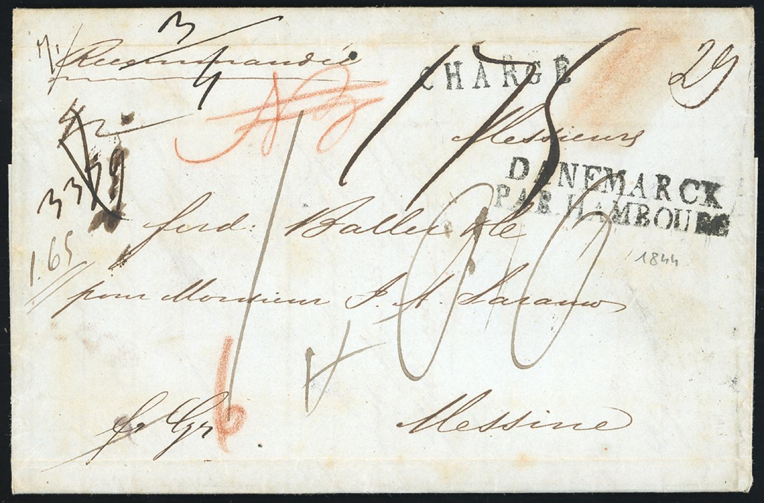 INCOMING MAIL 1844 - Lettera prefilatelica raccomandata da Copenhagen (Danimarca) 30/1/1844 a Messina, bollo di transito ad Amburgo al verso, vari segni di tassazione, giunta a destino il 17/2/1844. Molto bella e del tutto non comune.