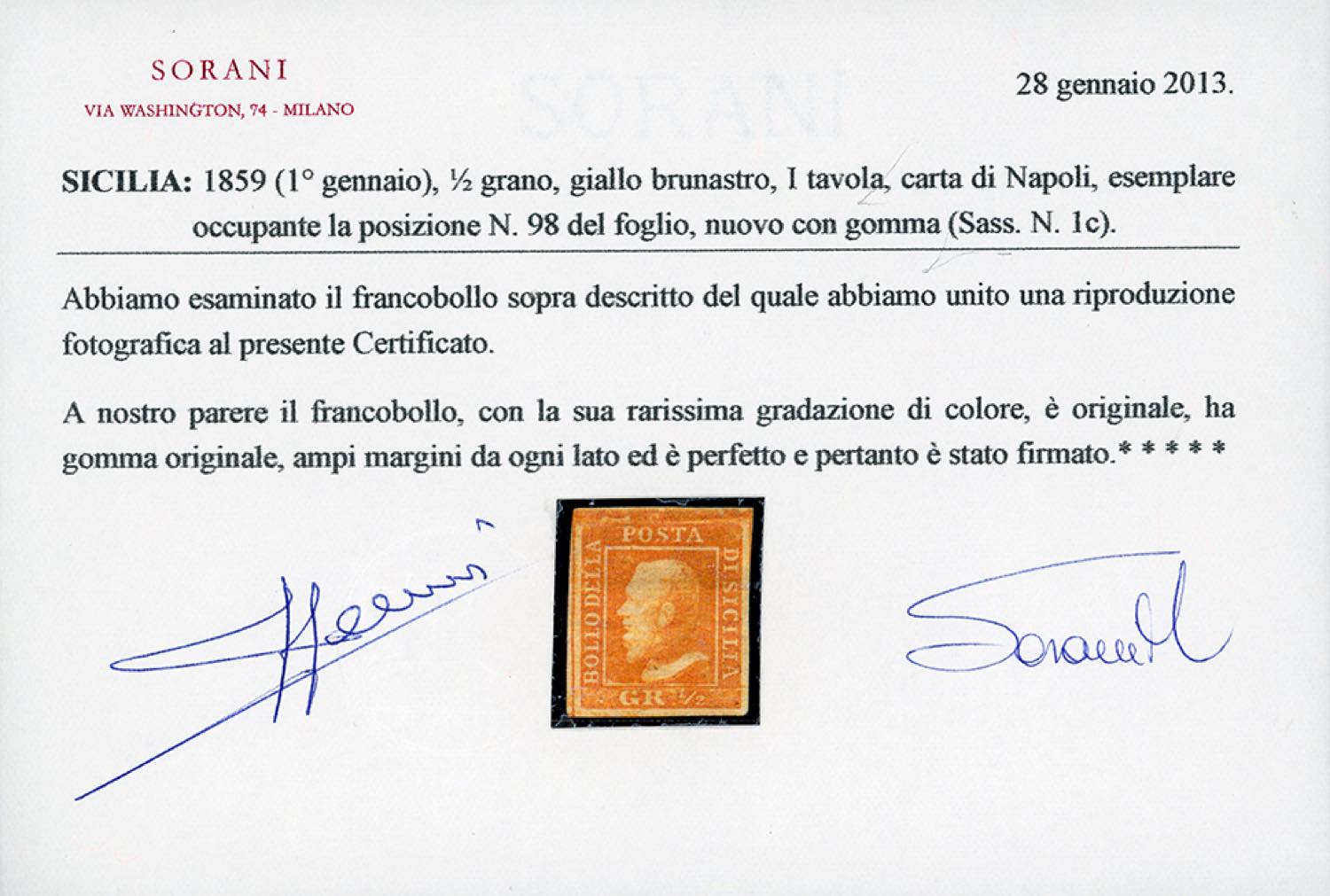 1859 - 1/2 grano giallo brunastro, carta di Napoli (1c), posizione 98 del foglio, nuovo, gomma originale, lieve traccia di linguella, perfetto. Splendido per freschezza e marginatura. Molto raro, specialmente di questa qualità. Emilio Diena, cert. Sorani.
