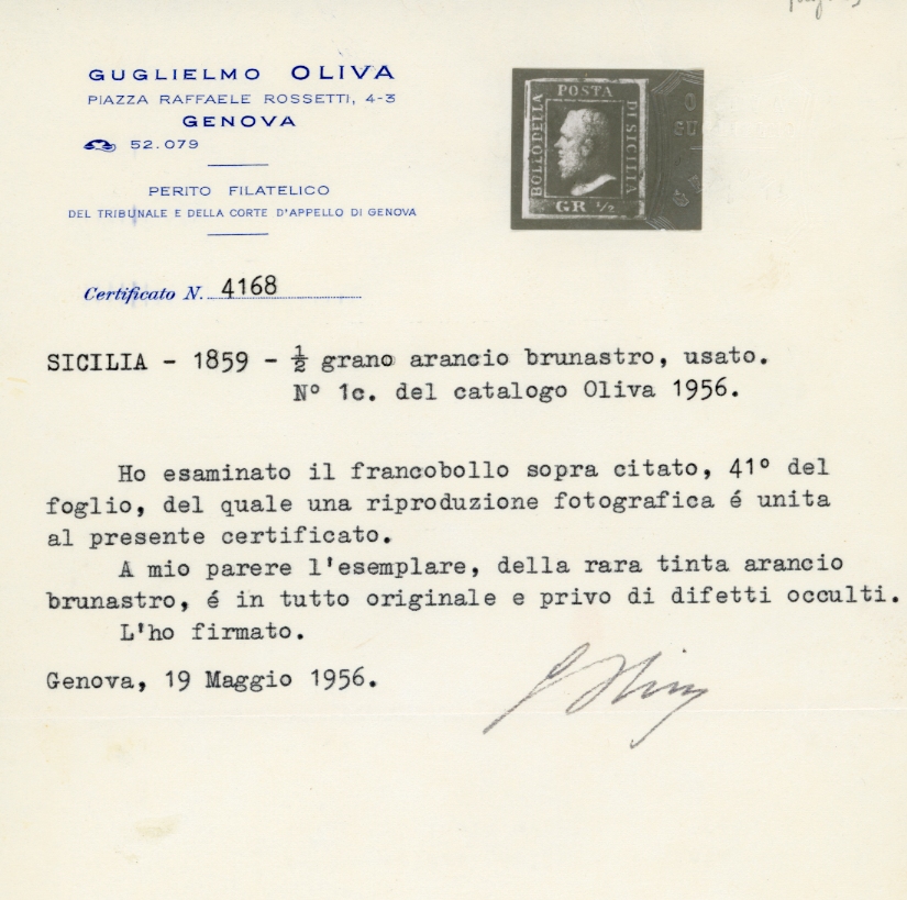 1859 - 1/2 grano giallo brunastro (1c), usato, perfetto. Rara tonalità, di ottima qualità. Em.Diena, Fiecchi, cert. G.Oliva, Ferrario.